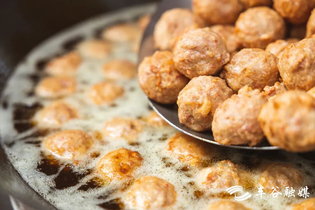 “新鲜出炉的炸肉圆子,可以先尝再买。”此时,炸圆子的摊位上也聚满了人,现场制作的肉圆子在油锅里上下翻腾,不多时就已经变成诱人的金黄色,让人垂涎欲滴。