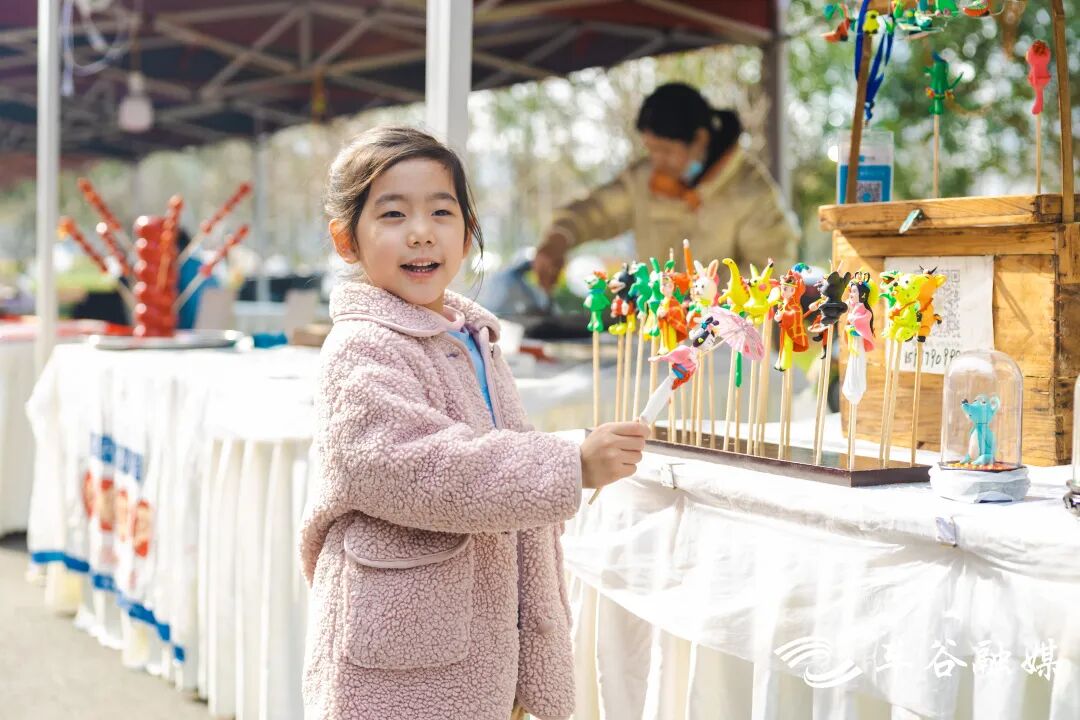 5岁的佳音小朋友站在面人的摊位与糖葫芦摊位中间,一会儿看看捏面人、一会儿看看做糖葫芦,不一会儿,她左手拿糖葫芦,右手拿面人,满载而归。
