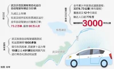 2023年,武汉市大幅扩展智能网联汽车开放测试道路范围,截至2023年底,全市累计开放测试道路里程已突破3378.73公里(单向里程),覆盖武汉12个行政区,辐射面积约3000平方公里,触达人口超770万,开放里程和开放区域数量保持全国第一。