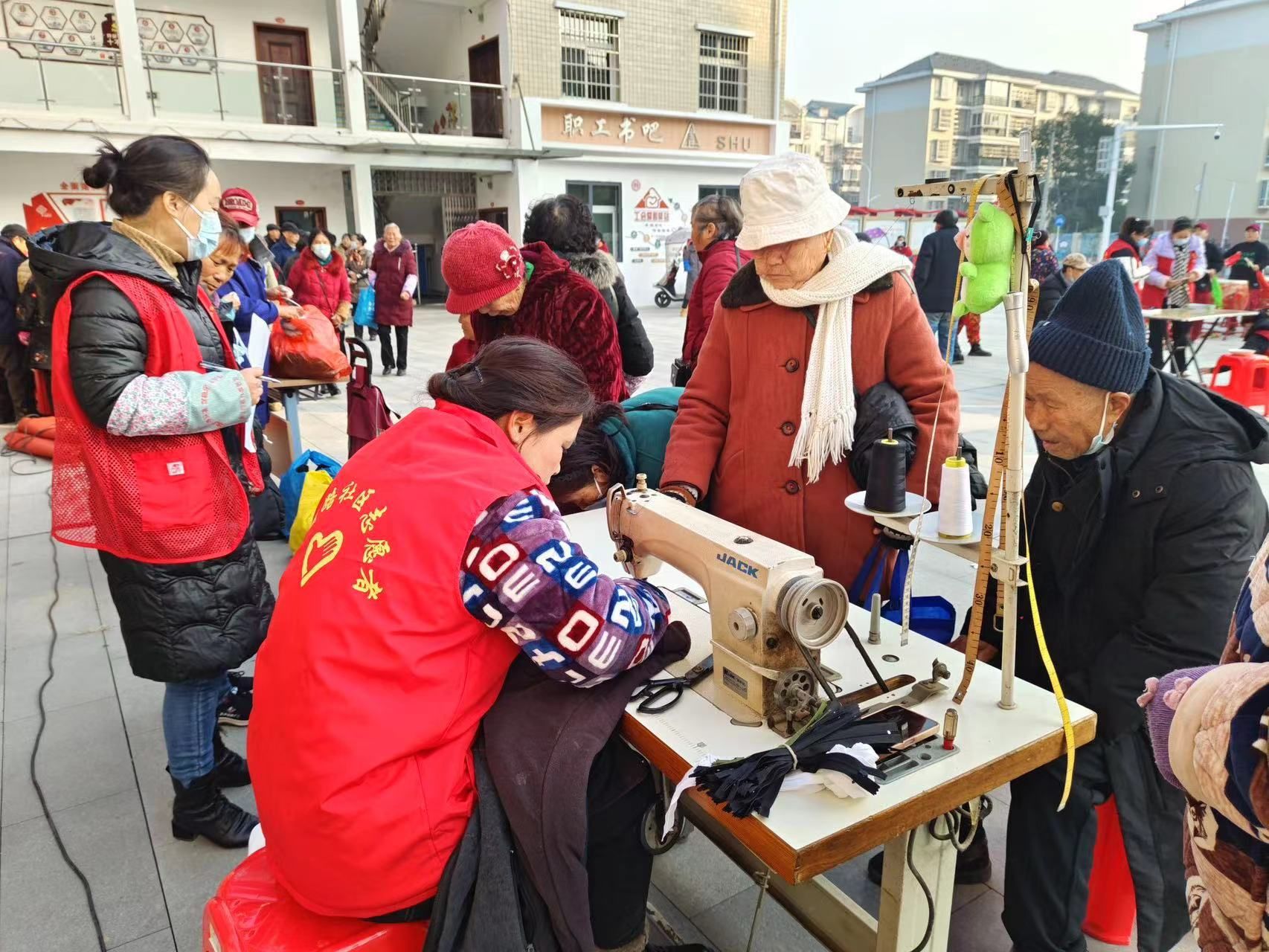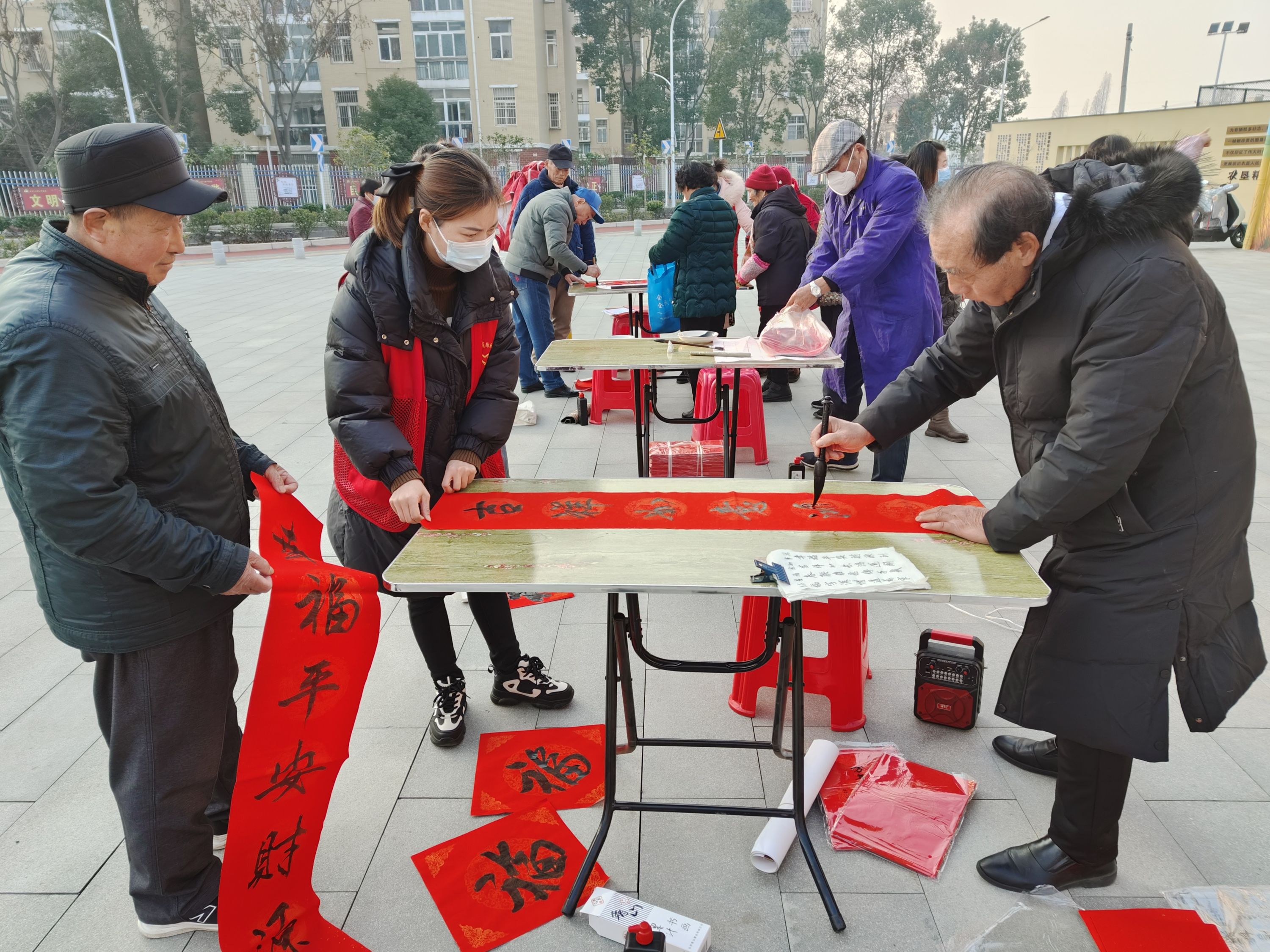 除了暖心的腊八粥,活动中还设置免费问诊、爱心理发、义务缝补、免费配钥匙、政策宣传、充缴天然气费、水费等多个便民摊位。活动邀请老书法爱好者们为居民写春联送大红“福”字,一幅幅精美的春联,洋溢着浓浓的年味,寄托着对新春的美好祝福和对生活的幸福憧憬。