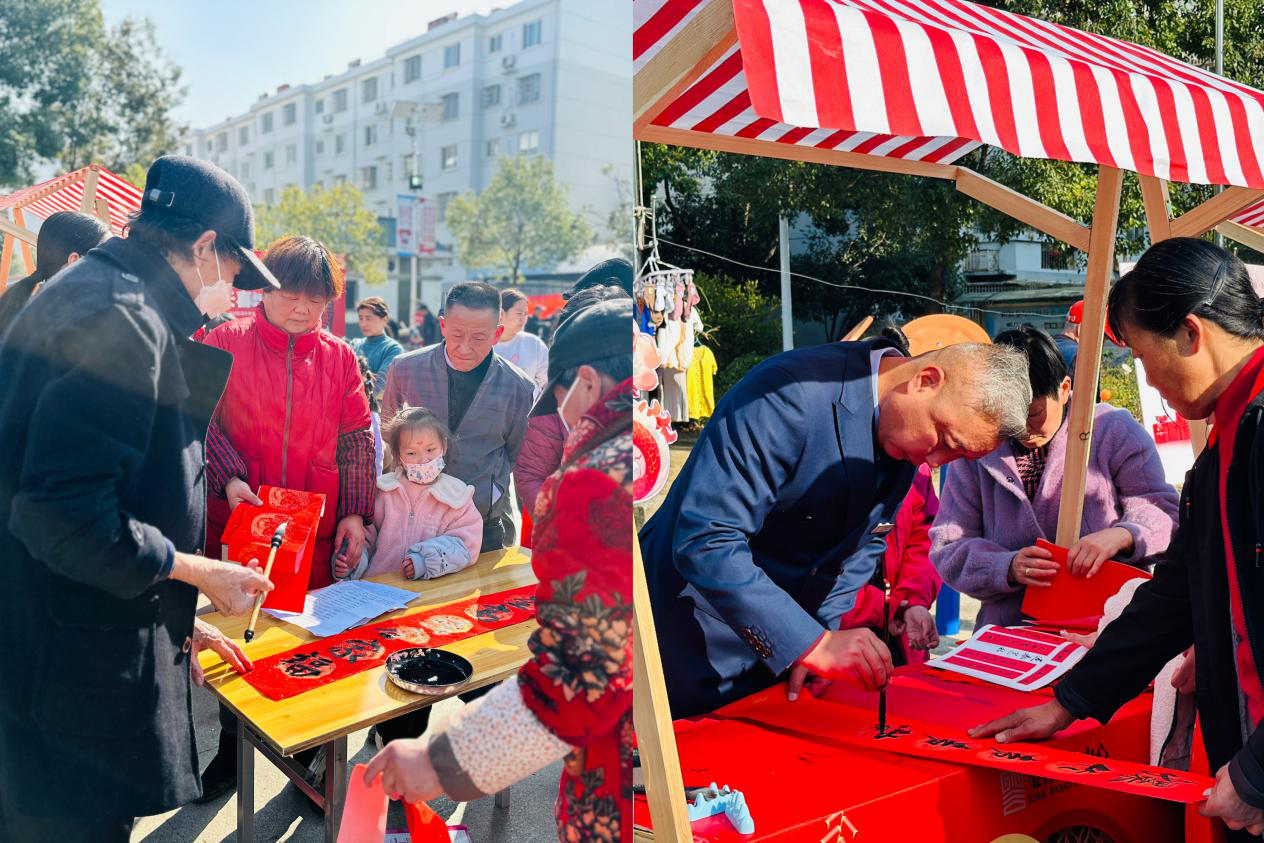 在写春联摊位前,书法老师为居民免费写春联福字。“老师请帮我写一张‘天赐财源随寿到 龙腾瑞气伴福来’,横批要‘吉星高照’。”第一排的汪爹爹迫不及待地将自己心仪的对联,告诉书法老师。红纸铺开,书法老师手持毛笔,蘸饱墨汁,认真地为居民书写。经开未来城的孙先生,双手拿着还飘着墨香的对联和“福”字,脸带笑意。