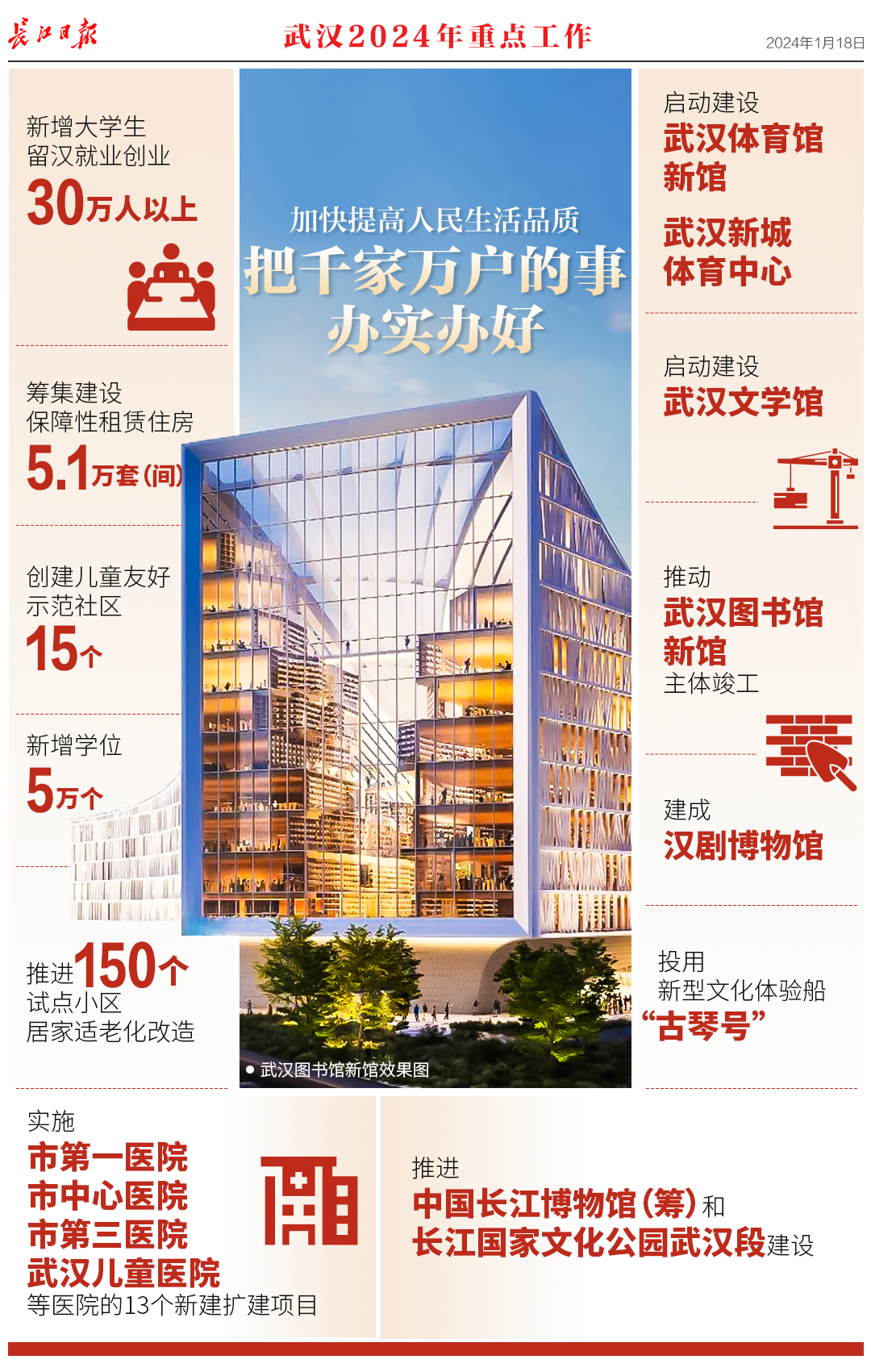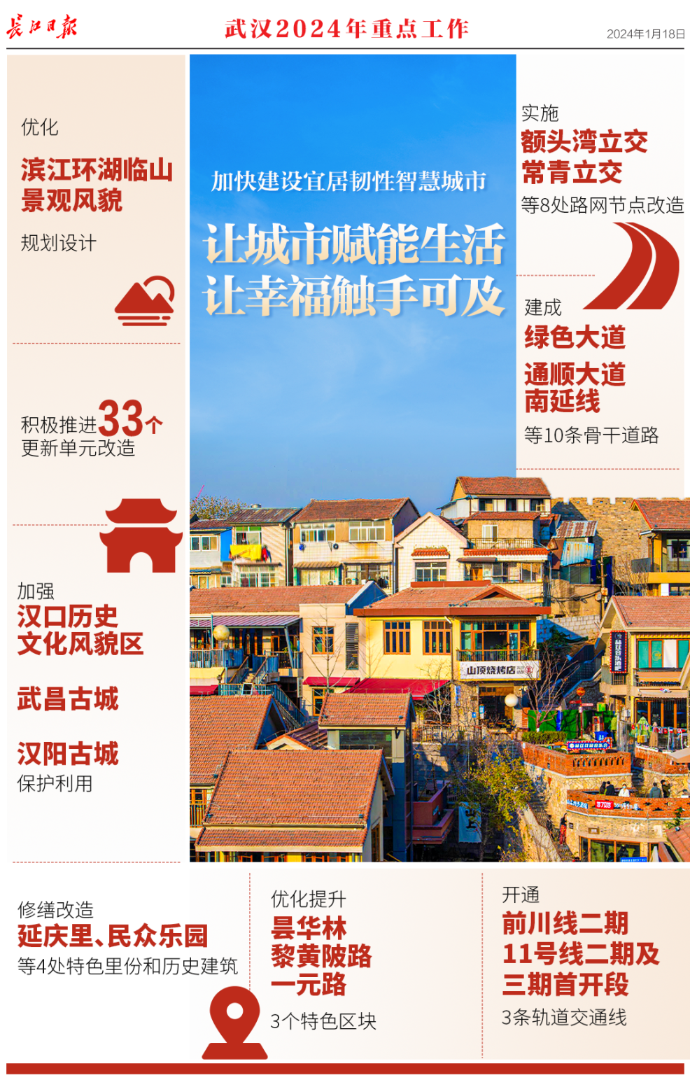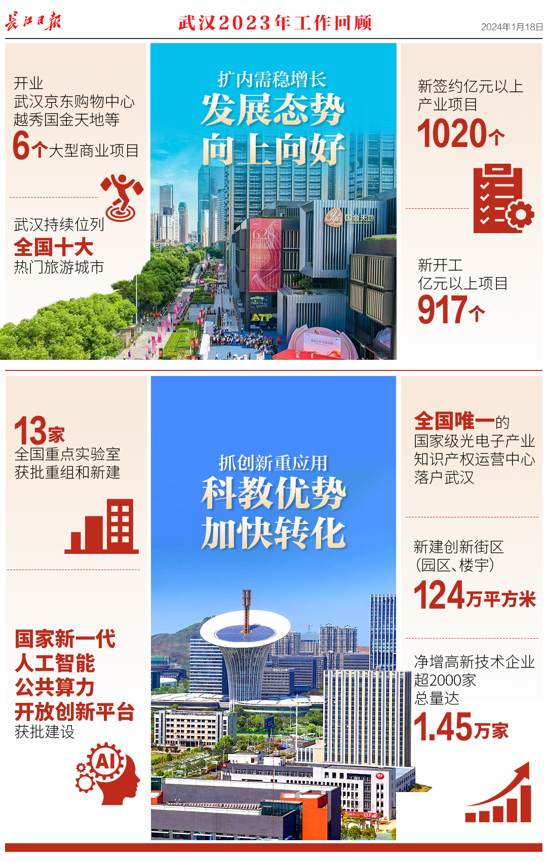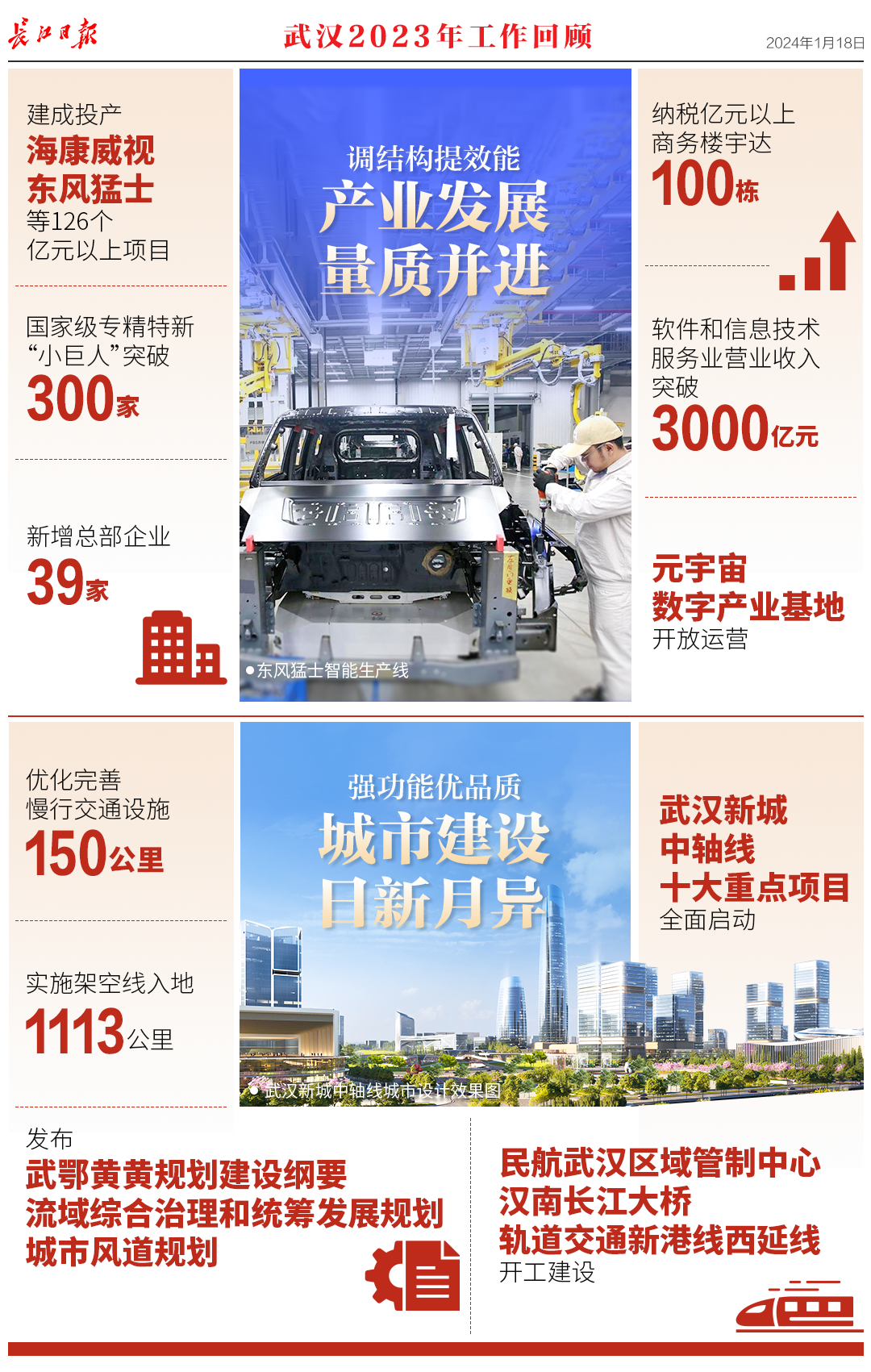 1月18日,武汉市第十五届人民代表大会第三次会议开幕,《政府工作报告》提交审议。报告回顾了2023年工作,提出了2024年重点工作。