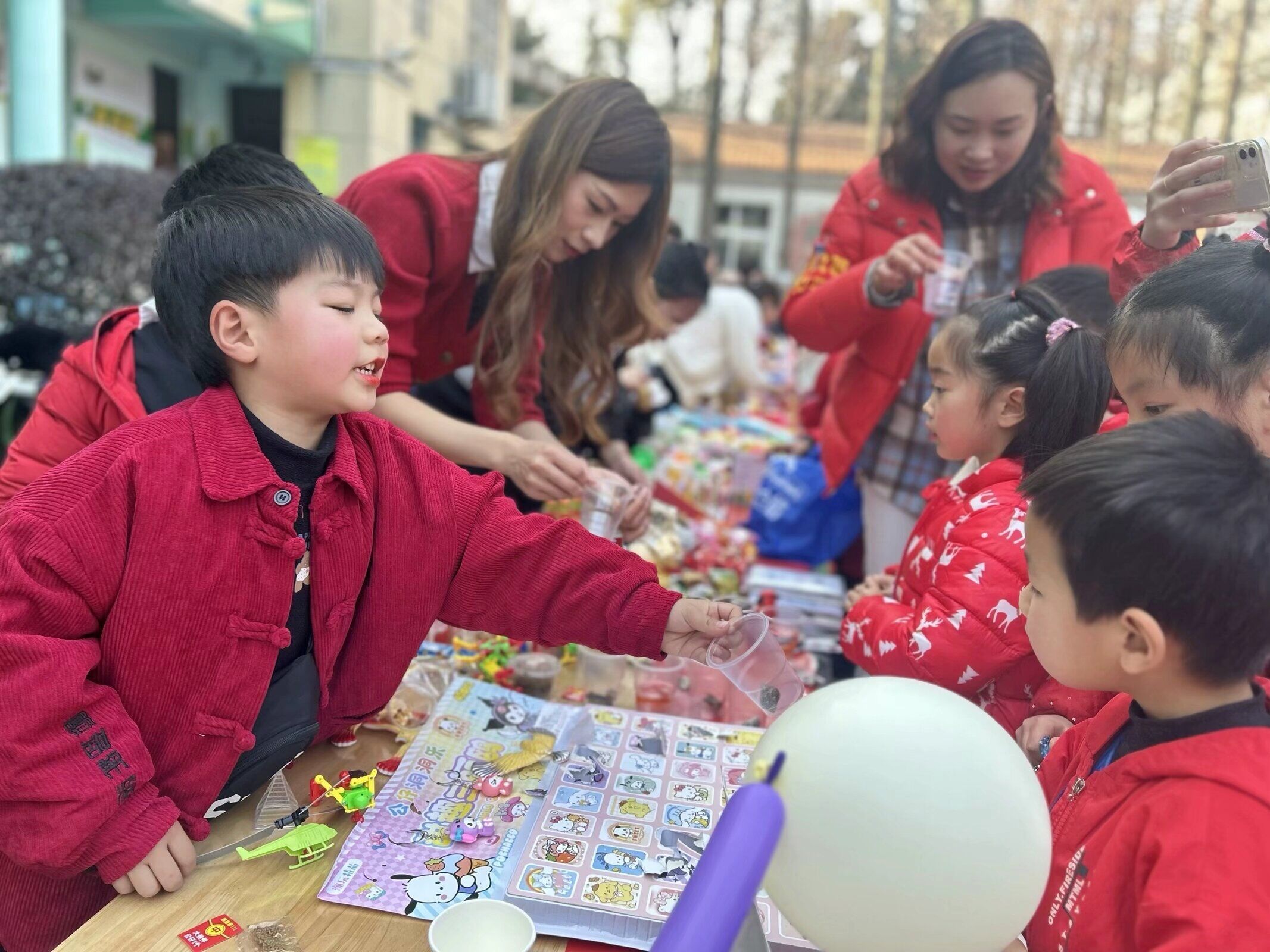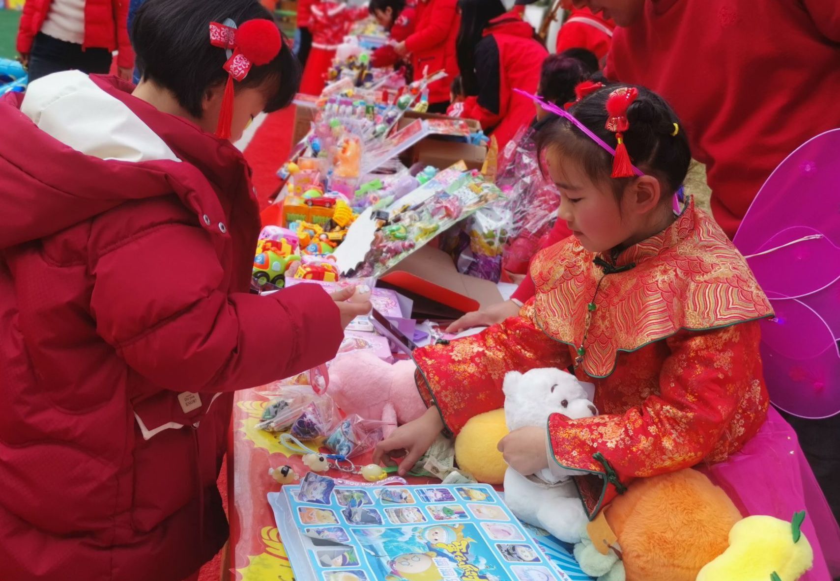 每个摊位前都挤满了学生,大家竞相选购自己喜爱的“年货”。“这个洋娃娃能卖给我吗?”“我最喜欢小金鱼了!”……萌娃们络绎不绝穿梭在年货街。
