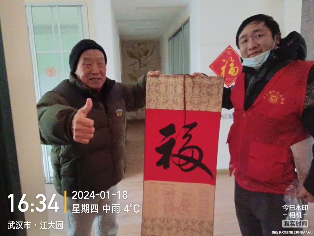 当天,社区党委成员和志愿者、邻里长、网格员挨户上门拜访老弱病残和失独家庭,老书法爱好者们将写好的230副福字和暖手筒送到400名空巢、独居、高龄老人家中。一张张喜气洋洋的福字,寄托了社区对困难弱势群体的关爱慰问和新年祝福,小区居民也纷纷向志愿者们的关爱表示诚挚的感谢。