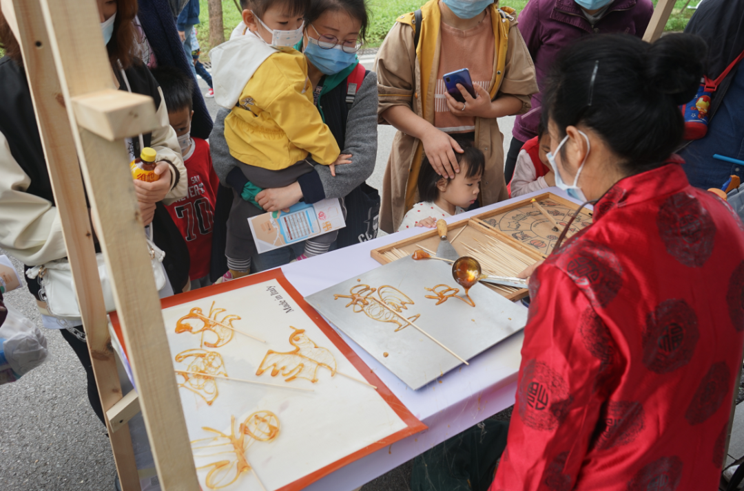 父子两人首先来到非遗文化市集展区,在吹糖非遗传承人朱红彦的指导下,陈宇涵给自己做了一条龙,一边品尝着甜蜜的糖龙,一边奔向下一个文化摊点打卡。