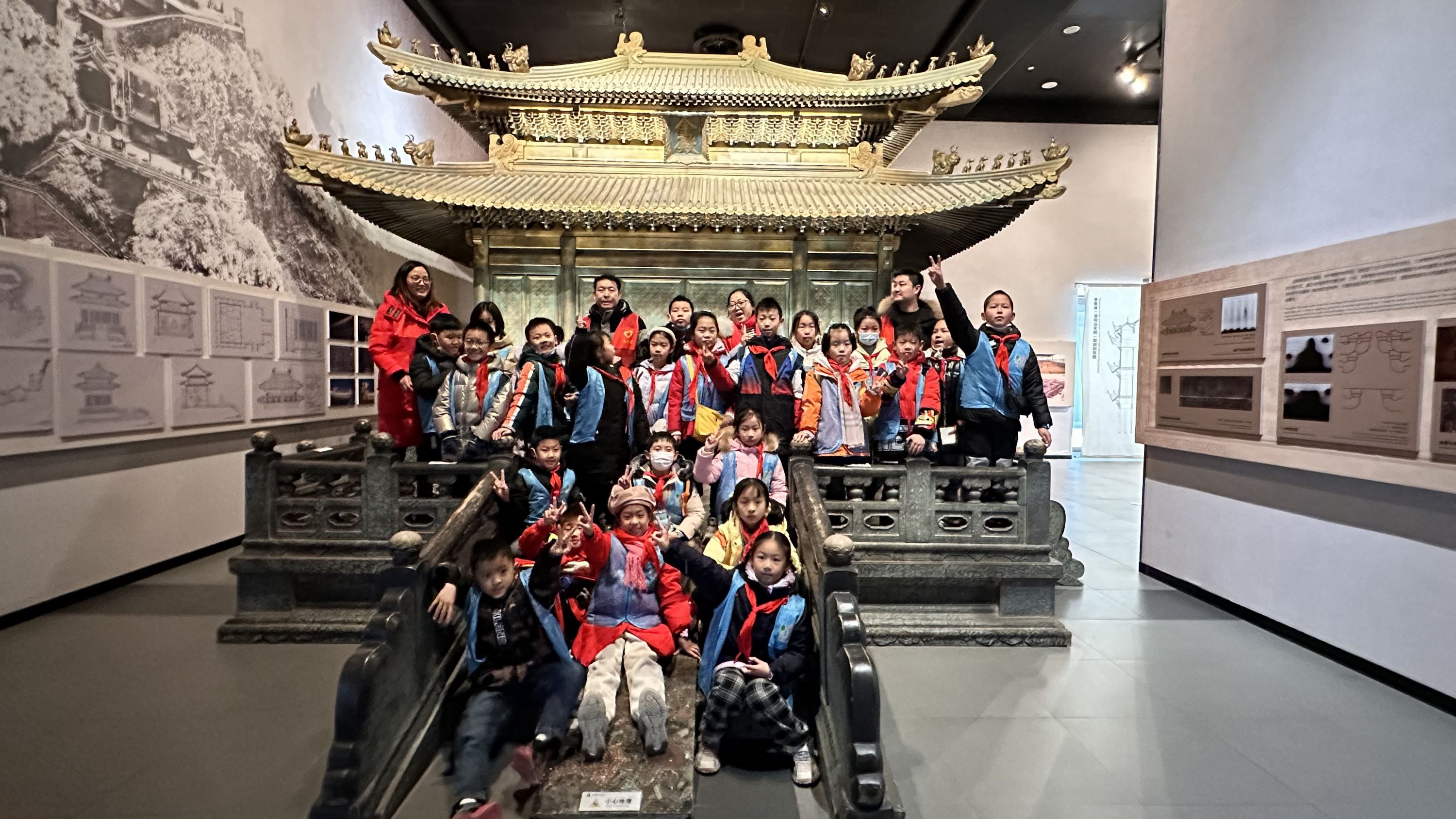 有孩子问:“老师,这房子怎么断了?”讲解员老师笑着说:“这不是断了,是一个剖面图,让大家更能直观看出房屋里面的结构。”“老师,金殿上的金和铜没人偷吗?”“不会,古人采用了一些特殊工艺,不好偷,而且很重。”孩子们兴趣盎然。