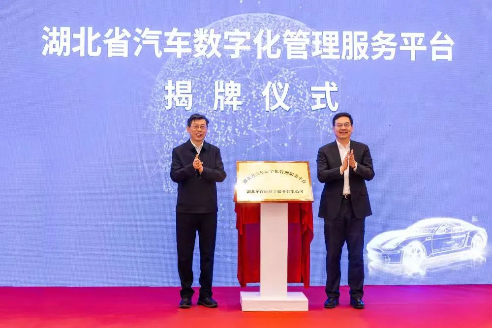 副省长盛阅春、中国电动汽车百人会副理事长兼秘书长张永伟为湖北省汽车数字化管理服务平台揭牌。