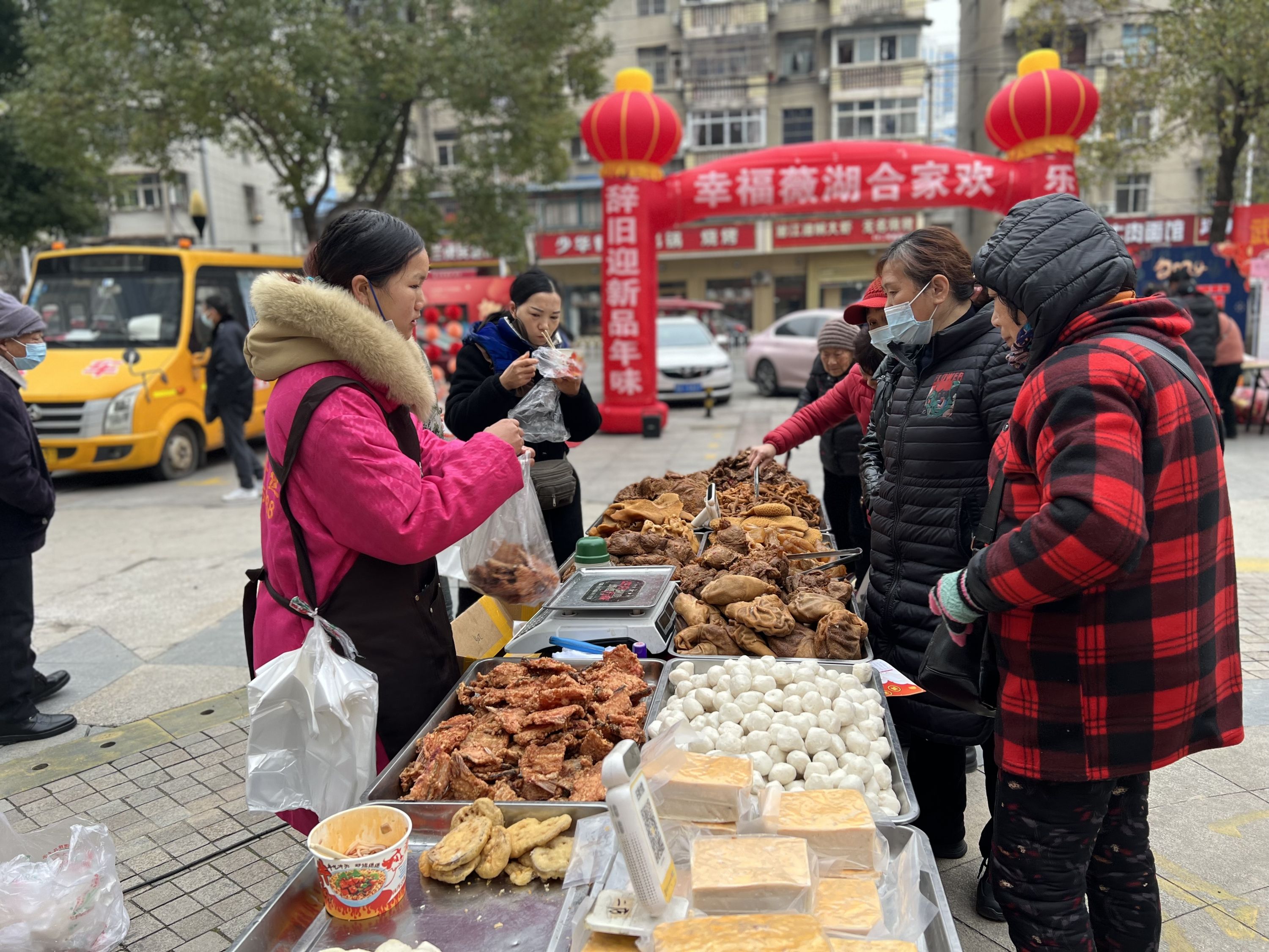 这是薇湖路社区首次举办年货节活动,社区提供平台,吸引爱心商家入驻,带动周边居民参与。现场有米面粮油、农副产品、特色卤味、酒水饮料、日常用品等,让居民们能在家门口“打年货”。