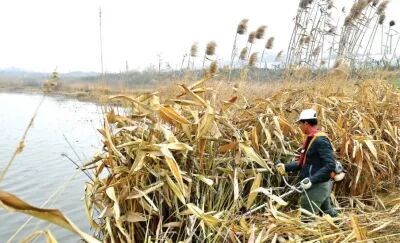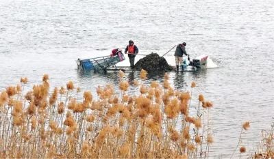 1月26日,记者来到硃山湖西侧,只见湖水清澈见底,虽是隆冬季节,仍可见各类植物分布水体中,如同水下森林。湖岸上,护湖人员正在修剪岸边的菖蒲;湖面上,一艘水草收割船正在修剪作业,避免水中植物无序生长。