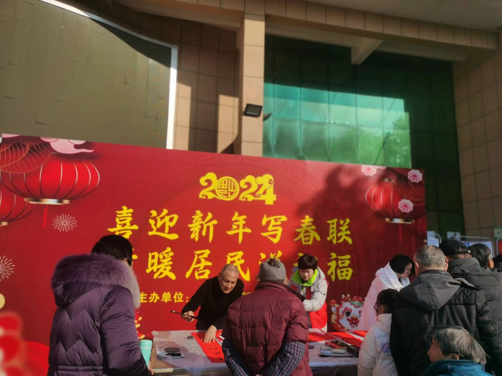 活动现场一片热闹景象,社区书法好者挥毫泼墨,各显身手,一副副飘着墨香的大红春联瞬间展现在众人眼前。社区网格员把写好的春联铺开,待墨干后,方便居民带回家,居民群众接过写满祝福和美好祝愿的对联,喜悦之情溢于言表。