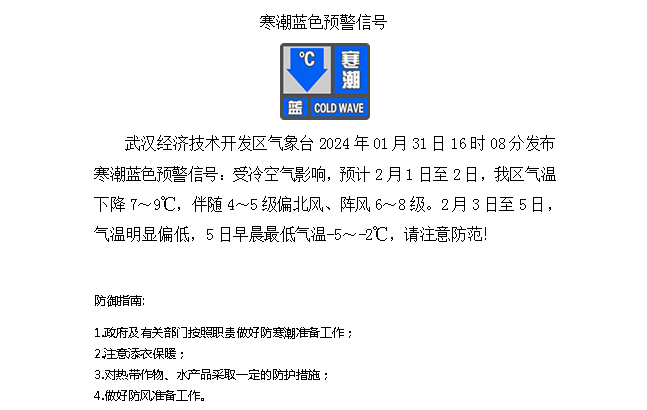 车谷融媒1月31日讯 武汉经开区气象台1月31日16时08分发布寒潮蓝色预警信号:受冷空气影响,预计 2月1日至2日,我区气温下降7℃~9℃,伴随4~5级偏北风、阵风6~8级。2月3日至5日,气温明显偏低,5日早晨最低气温-5℃~-2℃,请注意防范! (来源:武汉经开区气象台) 【编辑:缑曼 审核:张敏 蒋秋雨 黄倩 姚子怡】 14
