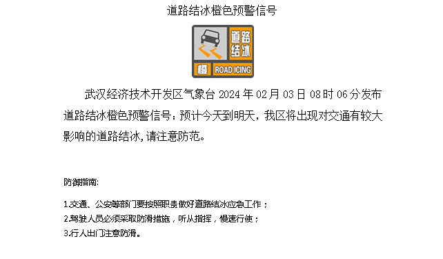 车谷融媒2月3日讯 武汉经开区气象台2月3日08时06分发布道路结冰橙色预警信号:预计今天到明天,我区将出现对交通有较大影响的道路结冰,请往意防范。 (来源:武汉经开区气象台) 【编辑:缑曼 审核:张敏 蒋秋雨 黄倩 姚子怡】