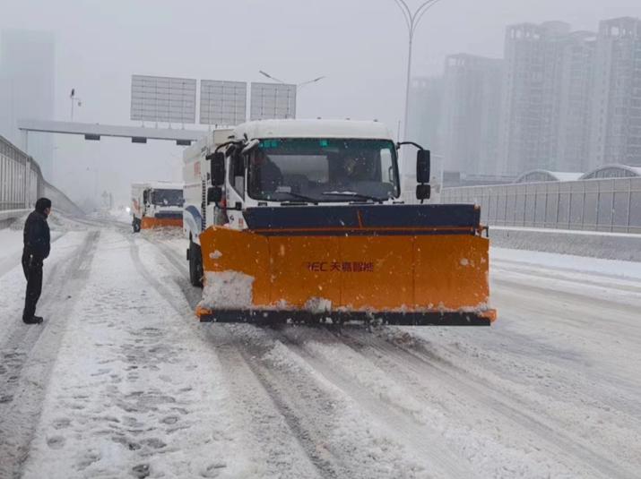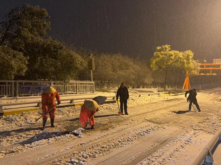 为有效清除路面积雪结冰,沌阳街道综合执法中心全员出动,连夜奋战,科学调度人员和机械车辆分区域逐路攻坚。迎着漫天雪花,冒着严寒,撒融雪剂、铲雪除冰,做好交通疏导,确保人员车辆安全通行。