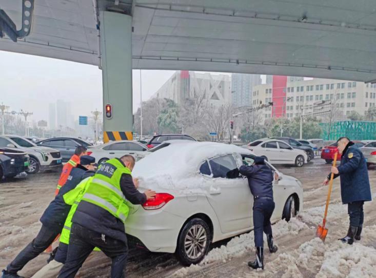 执法人员清理路段积雪时遇到多辆车辆打滑无法前行,主动上前帮忙推车。“车辆打滑,还好有执法人员帮忙推车,向风雪中的‘推车侠’们致敬!”出行驾驶员纷纷为综合执法中心的快速反应点赞。