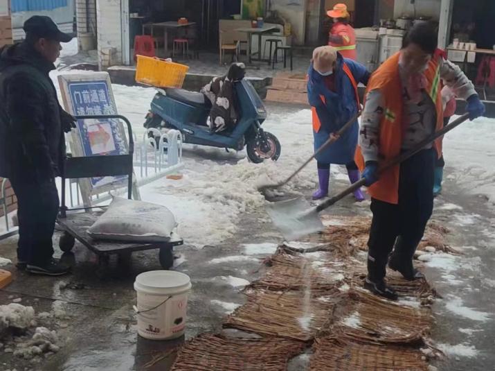 各农贸市场采取撒融雪剂、铺设毛毡防滑垫等多种措施,清除了市场进出口积雪,做好融雪防冻措施,及时处理积雪导致的顶棚垮塌,有效防止由于积雪造成的安全隐患,营造安全经营环境。