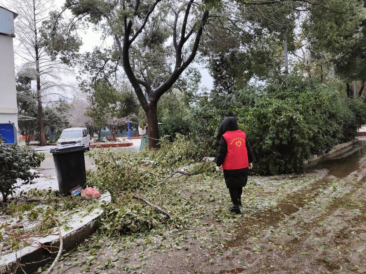 局机关党员们身着红马甲,不畏严寒,充分发挥团队协作精神,手持铁锹等扫雪工具,有条不紊地清理社区人行横道、周边街道等地的积雪。