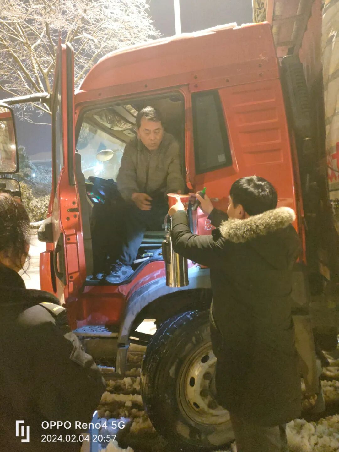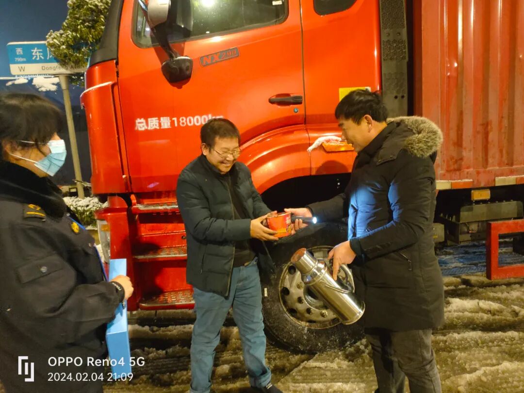 在武汉经开区徐家堡收费站,20余台大货车滞留。2月4日晚,区民政局救助管理站工作人员携带棉衣、食品、饮用热水等救助物资,为滞留司机送上物资。来自河南驻马店的货车司机魏玉广接过物资,不由得湿了眼眶,“这么大的雪你们还想着我们,给我们送物资。”