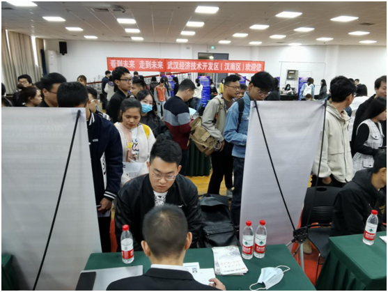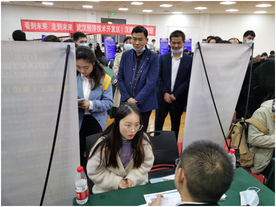 武汉经开区管委会办公室、区人力资源局等单位领导现场推介武汉经开区,并与企业负责人、求职大学生们亲切交谈,详细了解求职招聘情况。