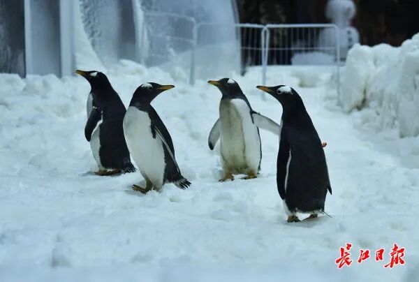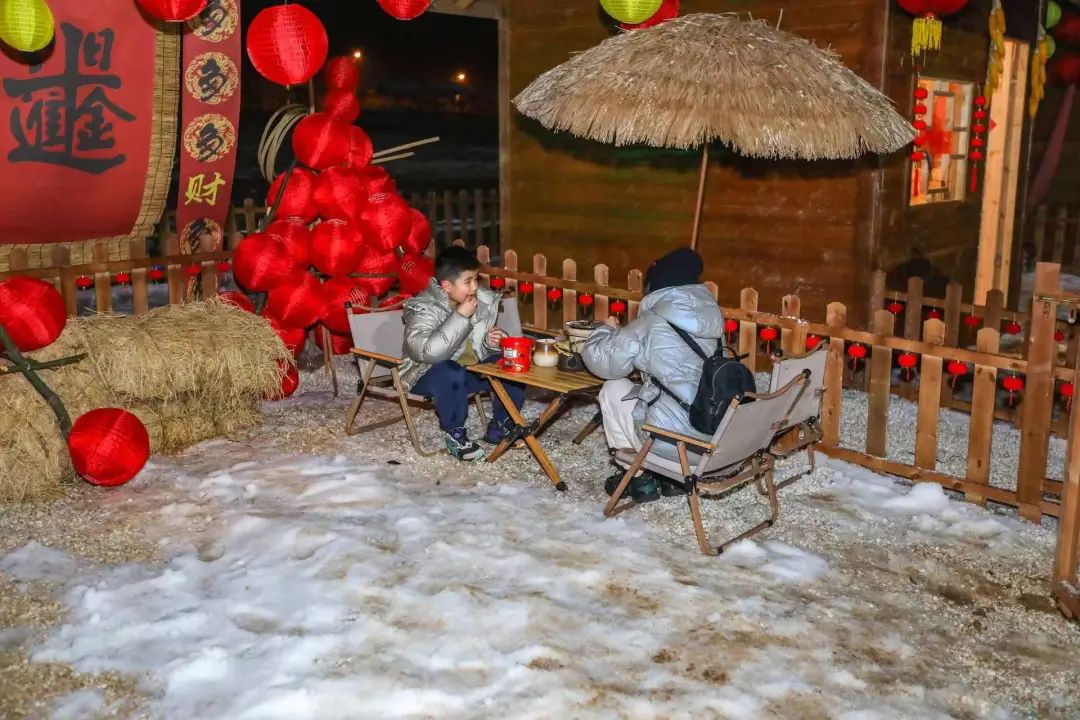 除了滑雪场,今年春节,园区还打造了冰雪庙会,将东北雪乡还原到了武汉,一座座木屋错落有致,挂满了春联、灯笼、诗画,年味满满。春节期间,这里还将上演儿童剧、川剧变脸、打铁花、企鹅大巡游等丰富多彩的互动活动。