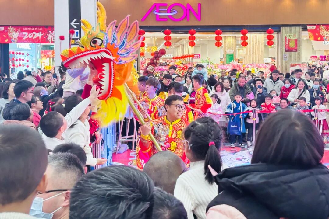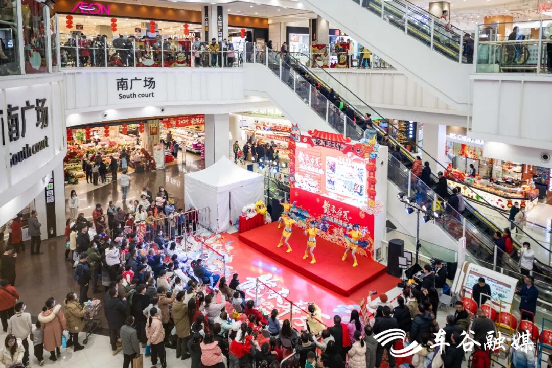 走进永旺梦乐城,中国结、红灯笼等春节元素将商场布置一新,新春气息扑面而来。舞龙、舞狮等特色演出吸引了不少市民前来打卡。