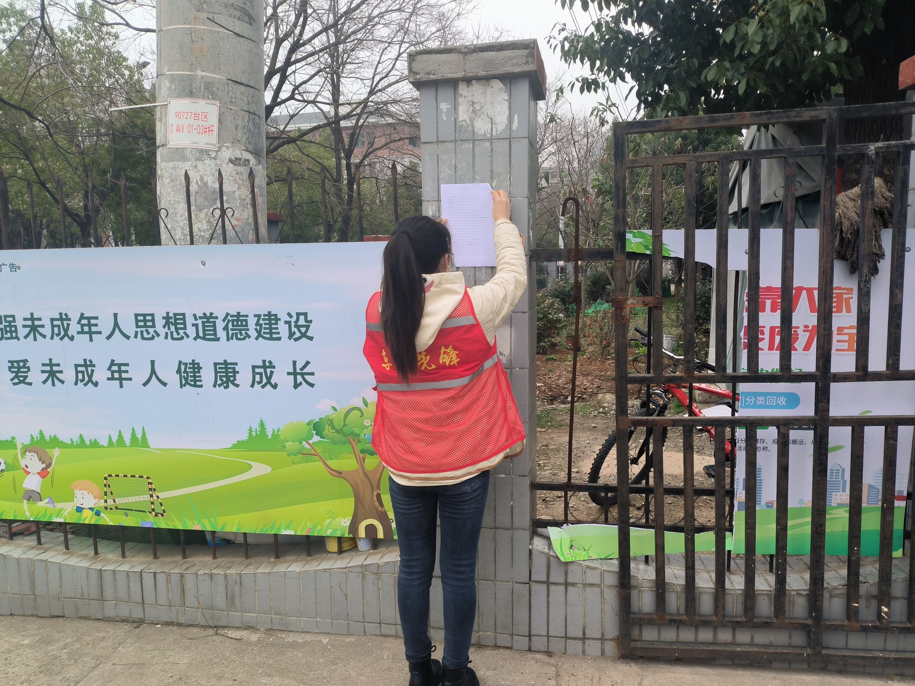 对小区老旧房屋和围墙进行巡查,在小区出入口张贴“温馨提示”,提醒辖区居民做好准备,关好门窗、注意保暖,雪天路滑,出行注意安全。利用“敲门行动”,深入弱势群体、独居空巢老人家中,提醒注意御寒保暖,防火防冻,遇到困难随时联系社区网格员。