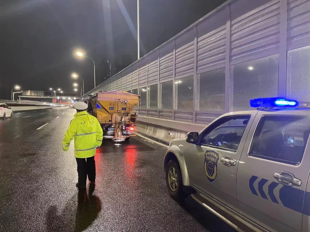昨晚,区交通大队民警、公路养护单位的工作人员沿线巡查辖区高速公路道路结冰、滞水等情况,并在桥梁和匝道易出现积雪结冰路段设立安全警示标牌。
