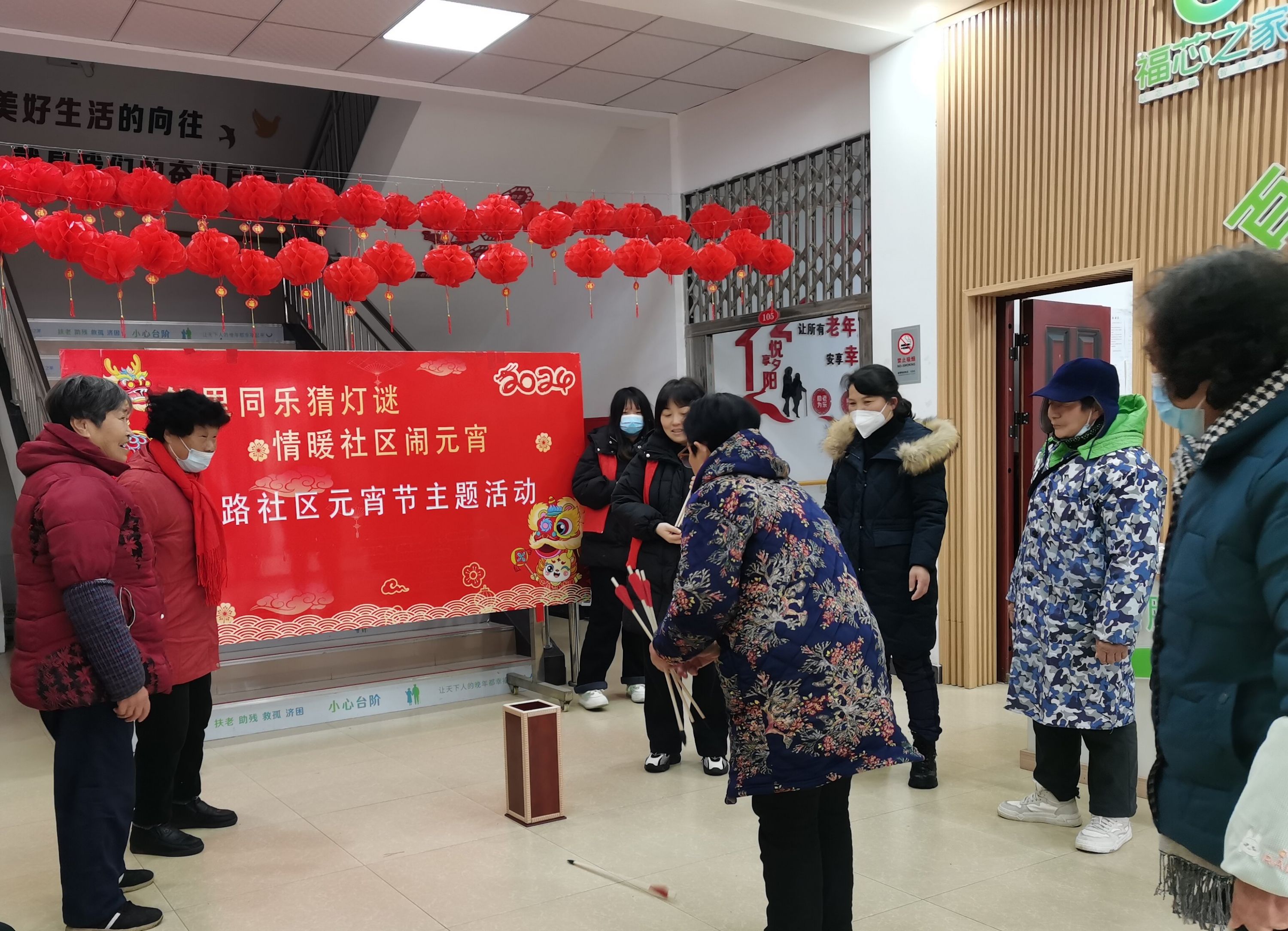 2月20日上午,纱帽街道滨江路社区开展的“邻里同乐猜灯谜 情暖社区闹元宵”文化活动热闹非凡。五颜六色的谜语灯笼在社区大厅和文化长廊上连成一排,分外喜庆。