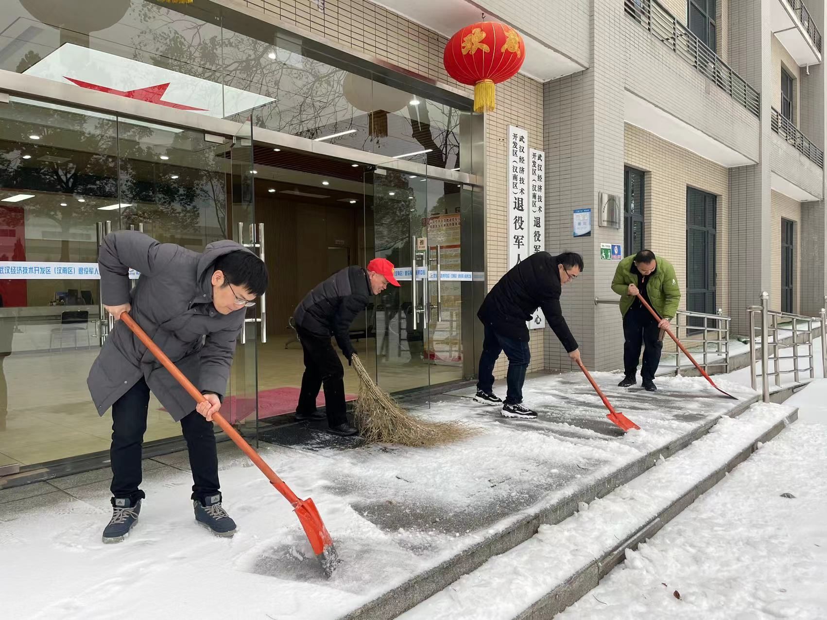 区退役军人服务中心是服务退役军人的前沿阵地。为防止积雪造成办公区域周边湿滑,为服务对象提供安全、温馨的办事环境,该中心全体工作人员迎着风雪,手持工具,铲的铲,扫的扫,同时不断提醒过往的行人注意安全。经过一上午奋战,将中心主要出入口和道路的积雪清扫干净,得到了前来办事群众的纷纷点赞。