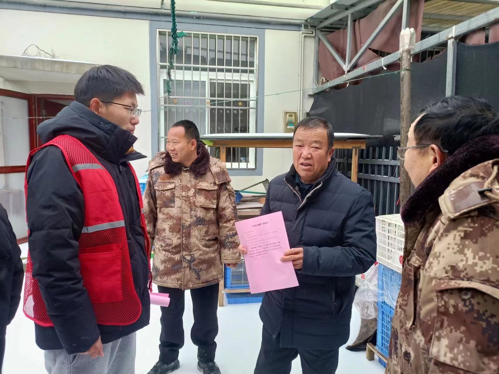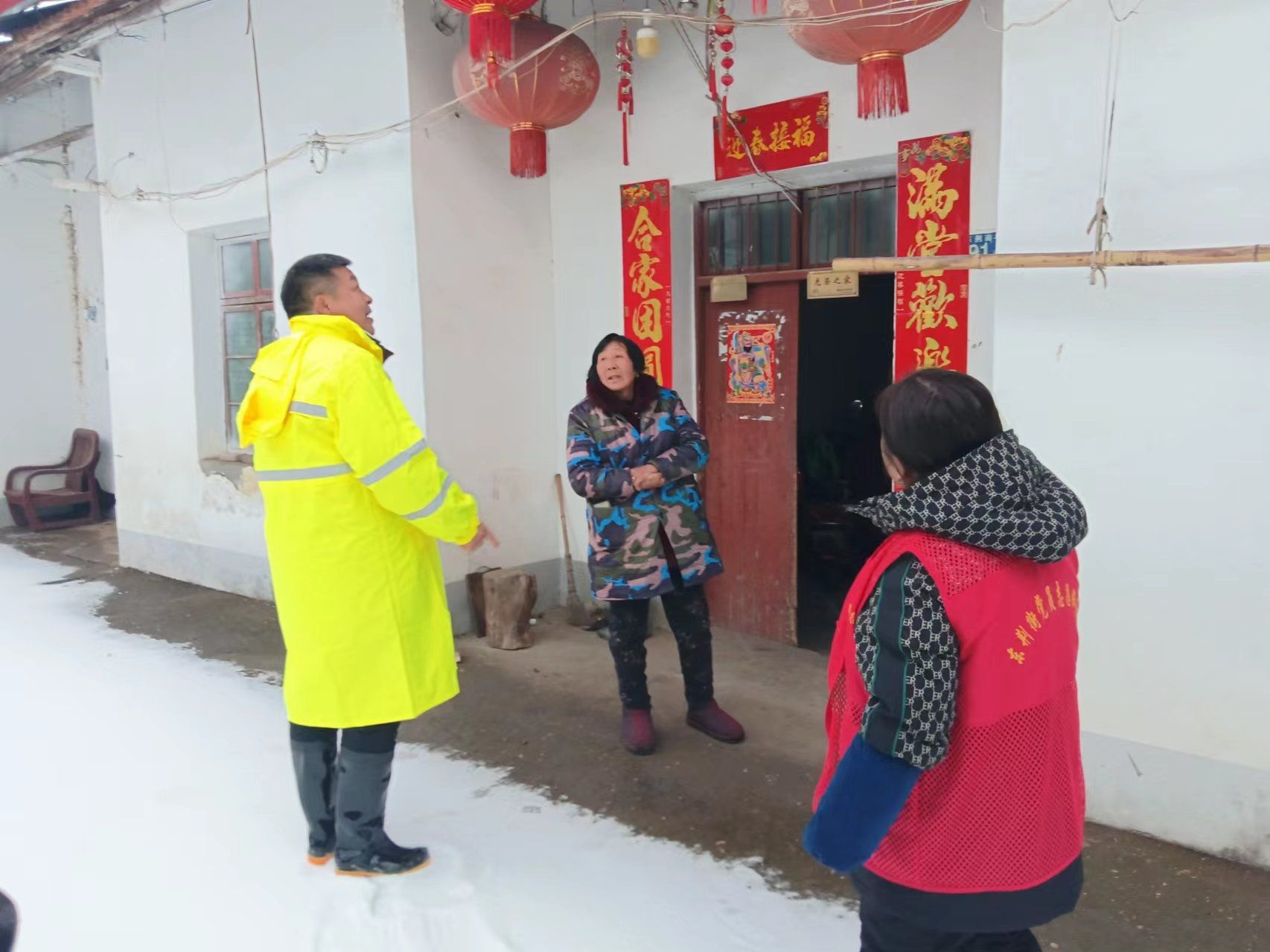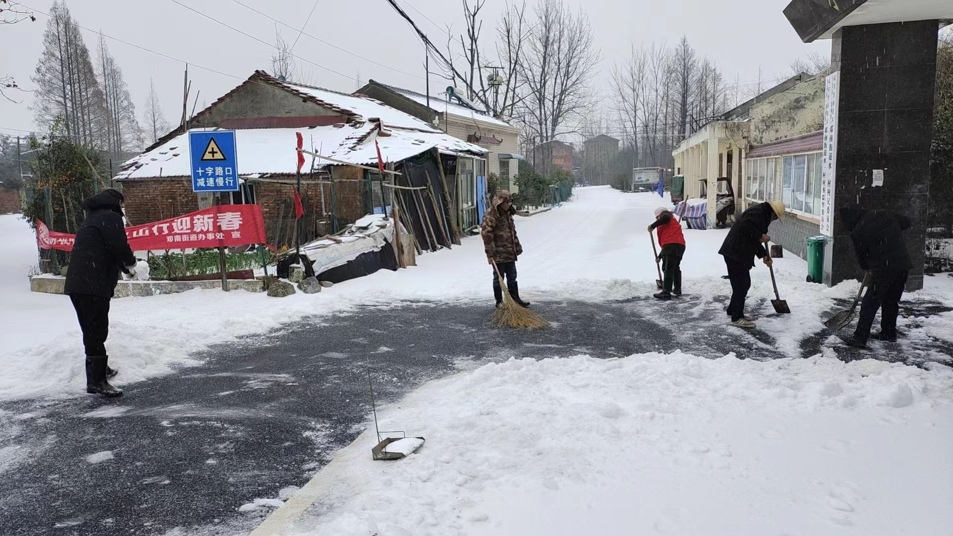 邓南街道退役军人服务站挨家挨户排查独居老人和困难群体,走访辖区军创企业厂房、蔬菜大棚、水果基地等,帮助群众清运大棚积雪和树木断枝,为群众开辟安全通道。