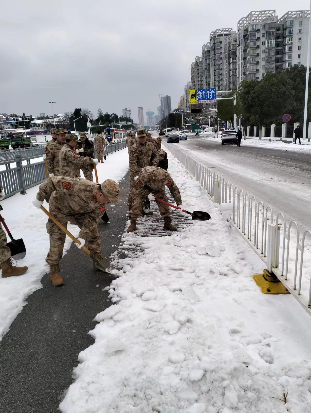 “同志们,这轮寒潮来势凶猛,我们既是民兵应急分队,也是退役军人志愿突击队,今天我们要迅速将任务路段的冰雪清除干净,大家有没有信心?”