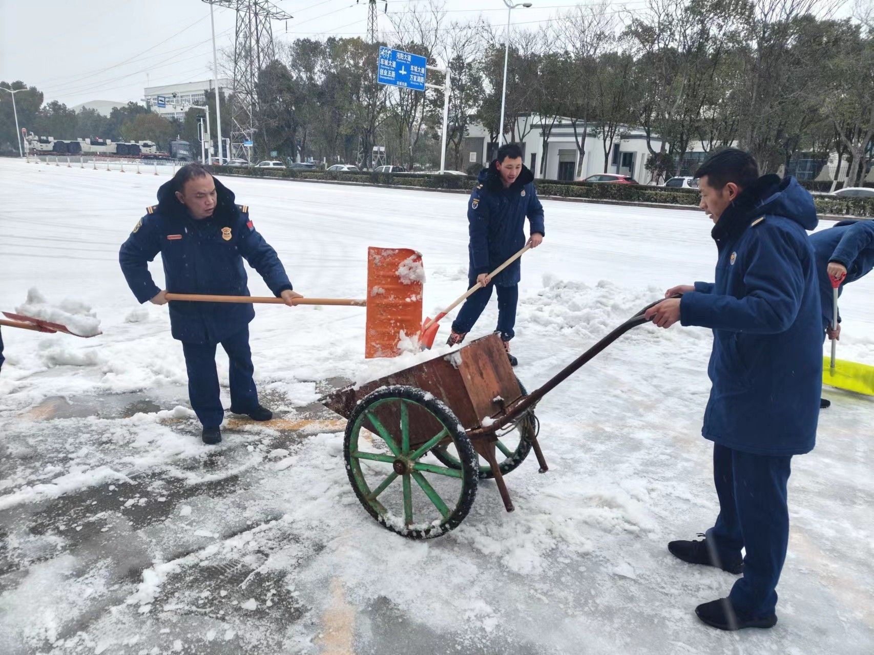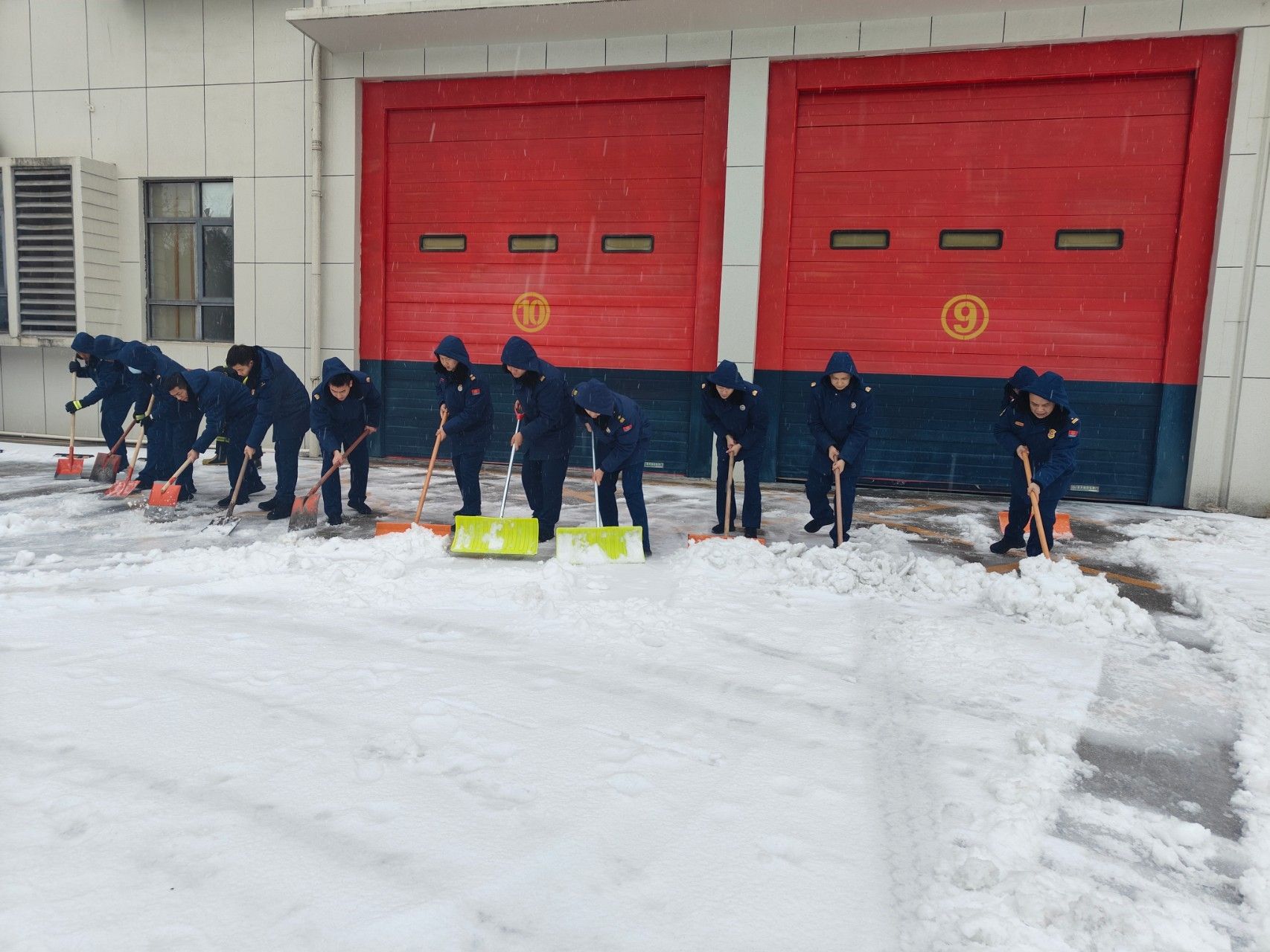 在保证正常执勤备战、稳控火灾形势的前提下,大队全体动员,通过铁锨铲除、扫帚清扫、水枪冲洗的方式清除营区内及周边主干道积雪,保障道路运行畅通。