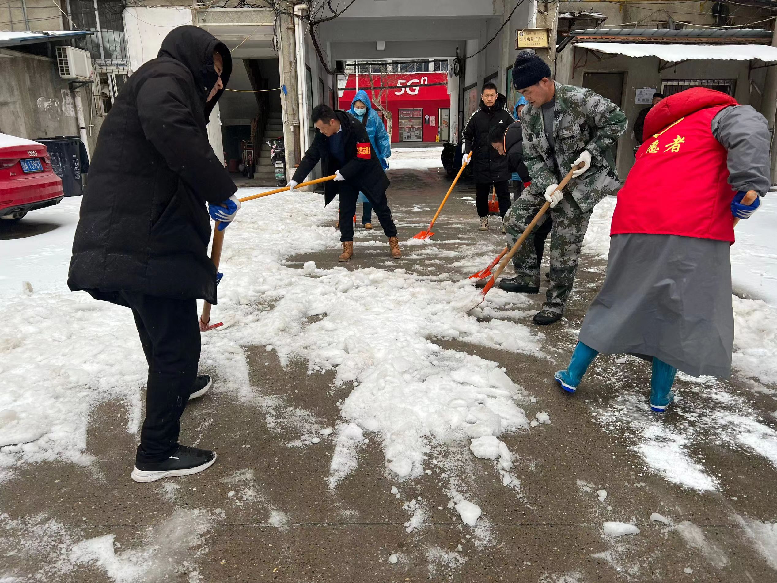 天气严寒,一个个身穿雨衣和红马甲行的身影出现在大街小巷,成为大家眼中亮丽的风景线。铲雪小分队的成员们手握铁锹,躬起身子哈着白气铲雪撒盐,迅速地清出一条条“爱心路”。