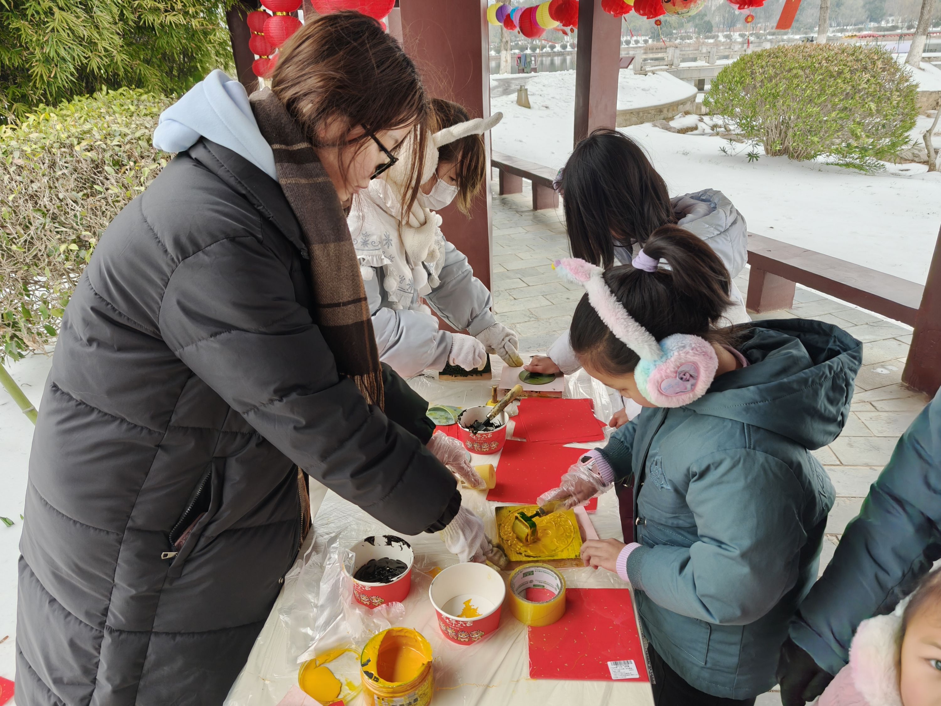 走进公园休闲长廊,彩灯高挂,知识性、趣味性十足的灯谜悬挂在彩灯下,吸引着众多游客驻足观赏。开动脑筋,猜中者可以获得一份精美小礼品。现场还设置了雕版印刷区,市民游客可以亲身体验拓印福字的乐趣和魅力,感受传统文化的魅力。