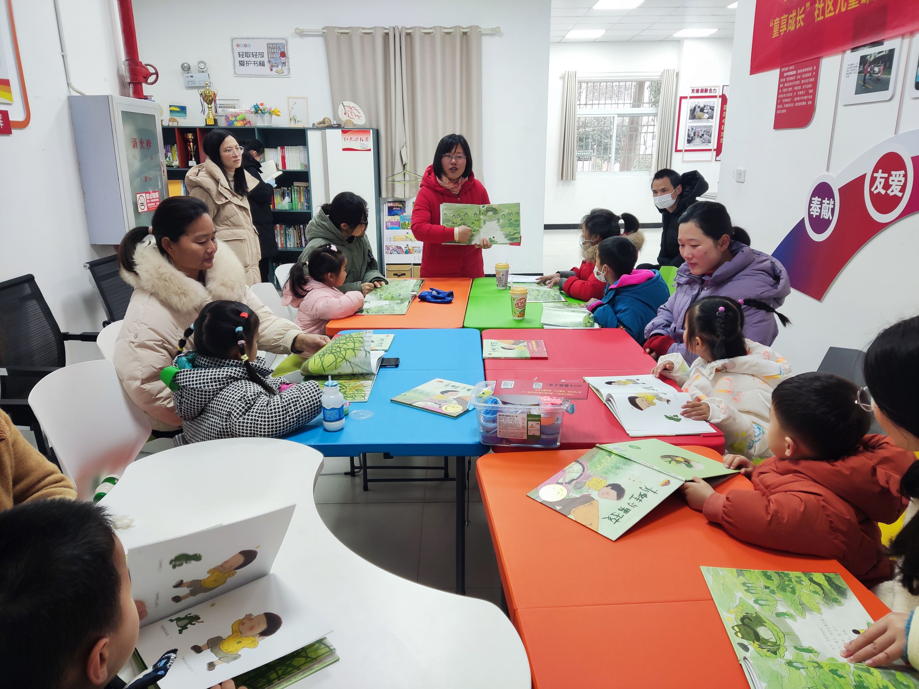 小朋友在家长的陪伴下,开心地领取精美绘本,项目志愿者王慧玲为小朋友们领读故事《青蛙与男孩》。在志愿者温柔的声音感染下,小朋友们被故事深深吸引着,跟随有趣的情节,还不时地学着绘本中青蛙的模样,吐舌头、拍肚子、发出“呱呱”声。