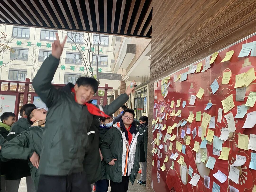 军山中学内,学生们在心愿墙前开心地蹦了起来。