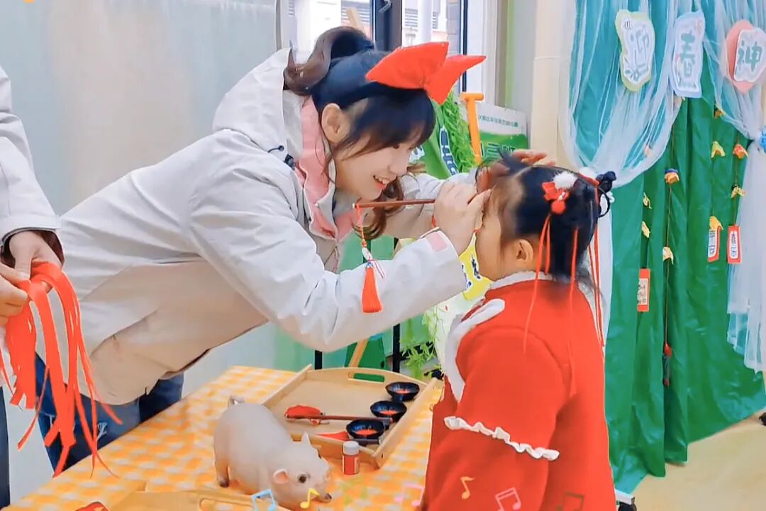 车谷育杰幼儿园的老师们给小朋友点朱砂系红绸,通过贴春、咬春、插春、戴春等活动,加深孩子们对“春”的认知和感受。