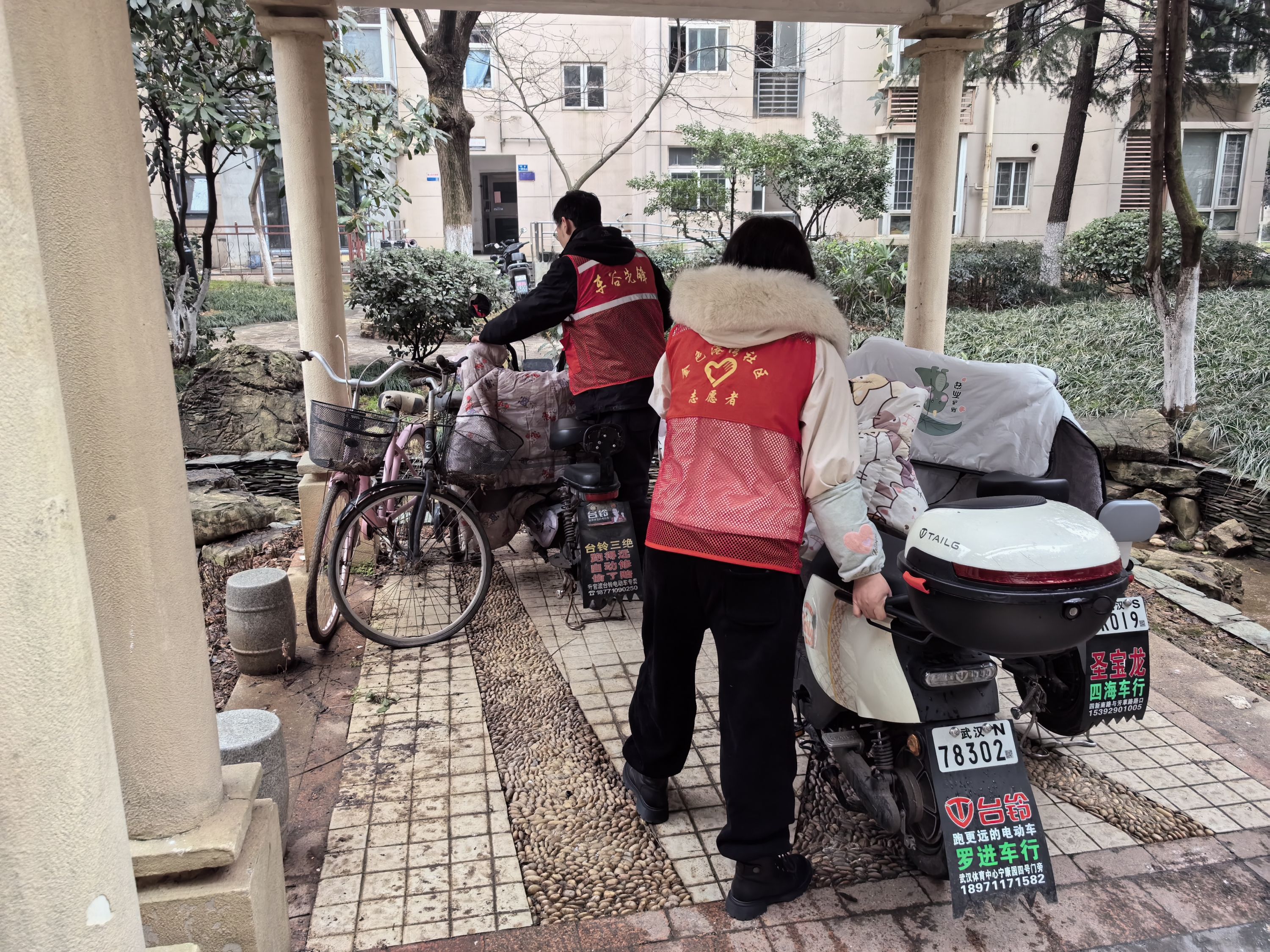 随后,大家对居民区楼栋进行安全巡查,重点检查电动自行车违停乱放、飞线充电等问题,并将停放在单元楼安全出入口的电动自行车进行有序安放。