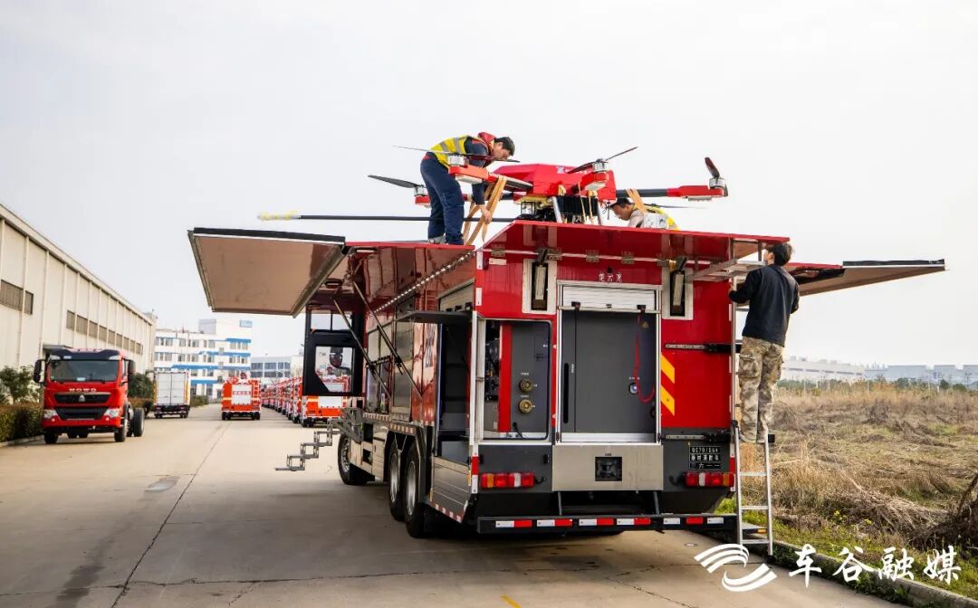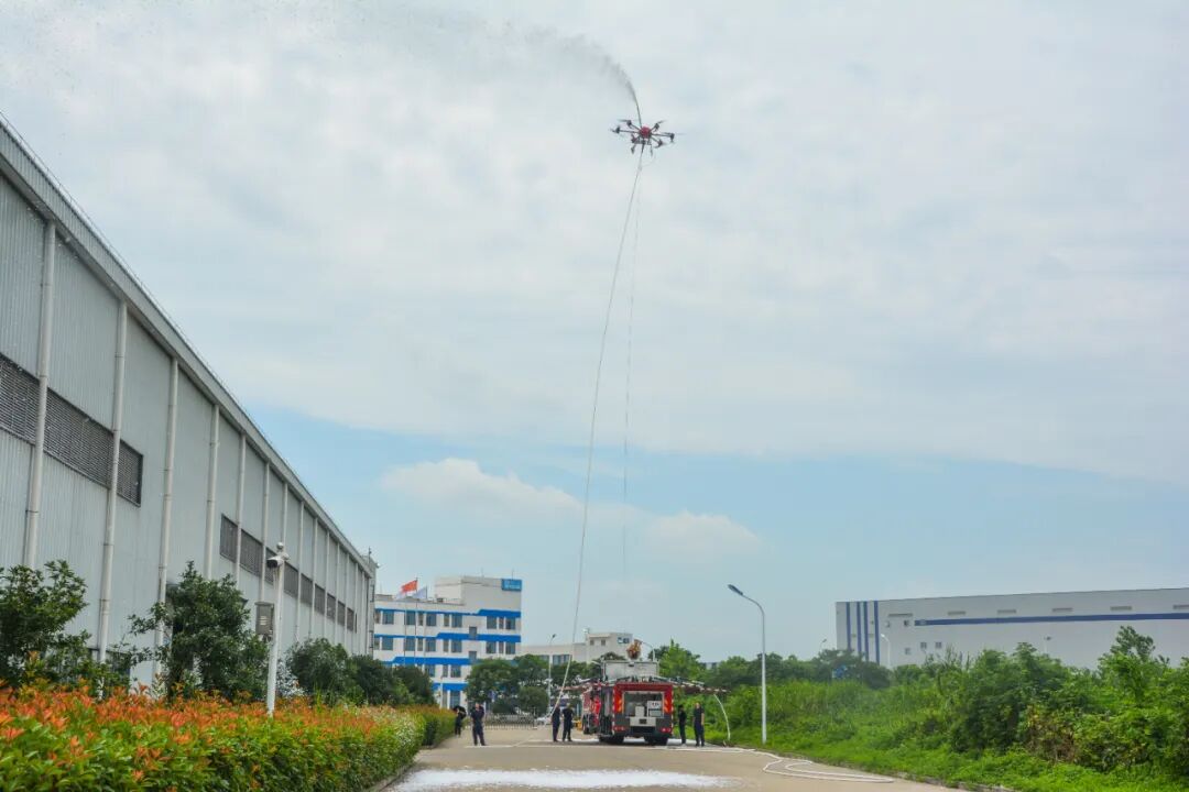 乍看,是一台普通消防车,但随着车身徐徐展开,一台无人机显露真容。启动按钮,无人机旋即腾空,最高可飞行至150米左右。下方,通过两条长长的管道,消防车将水、消防泡沫以及高压电源源不断供应,让无人机不间断地为高楼灭火,空中续航长达8个小时。