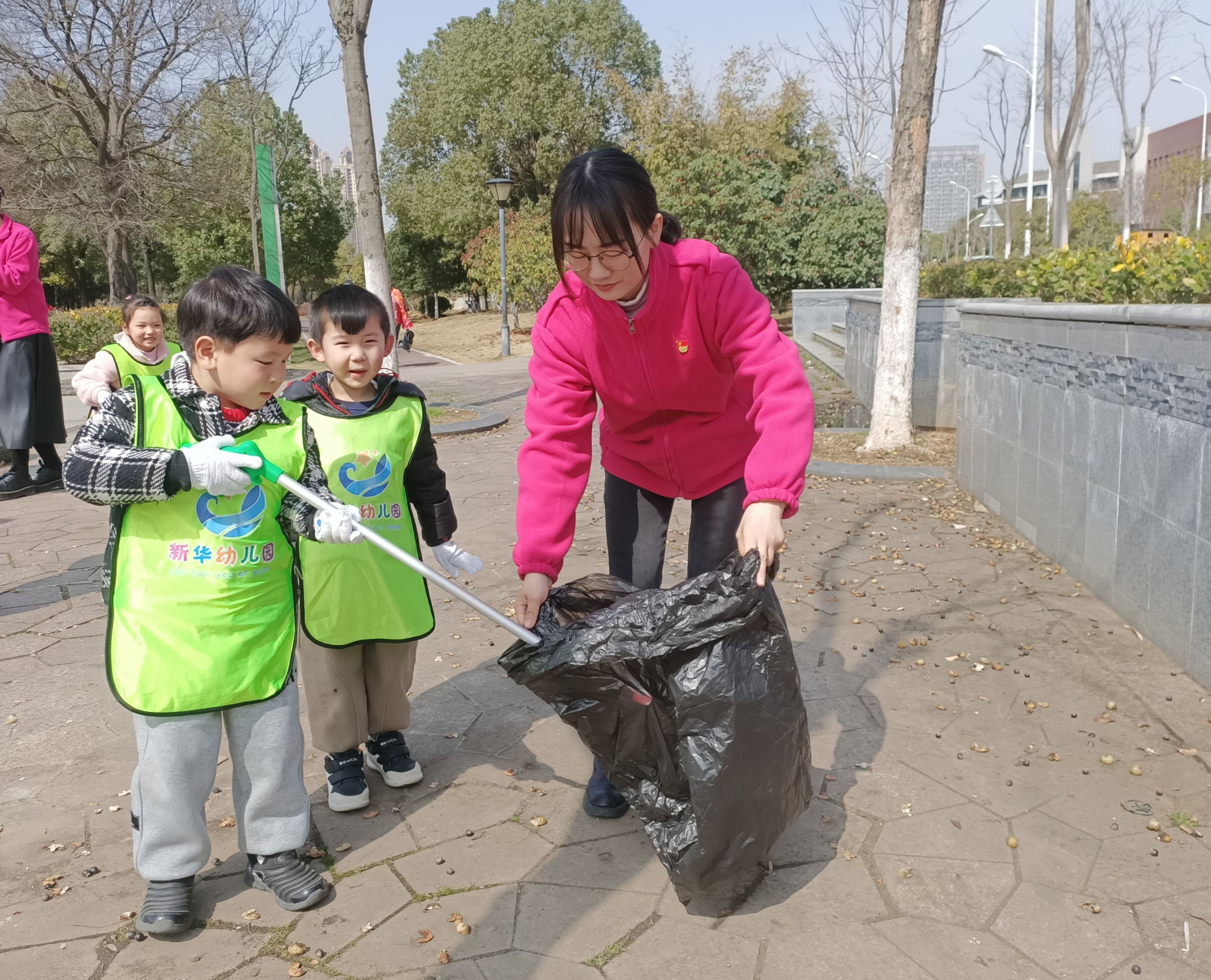 在党员教师的带领下,中班的小朋友来到幼儿园周边公园,手持垃圾袋、夹子等工具,对公园路面、绿化带垃圾等进行清理,共同维护美好环境。