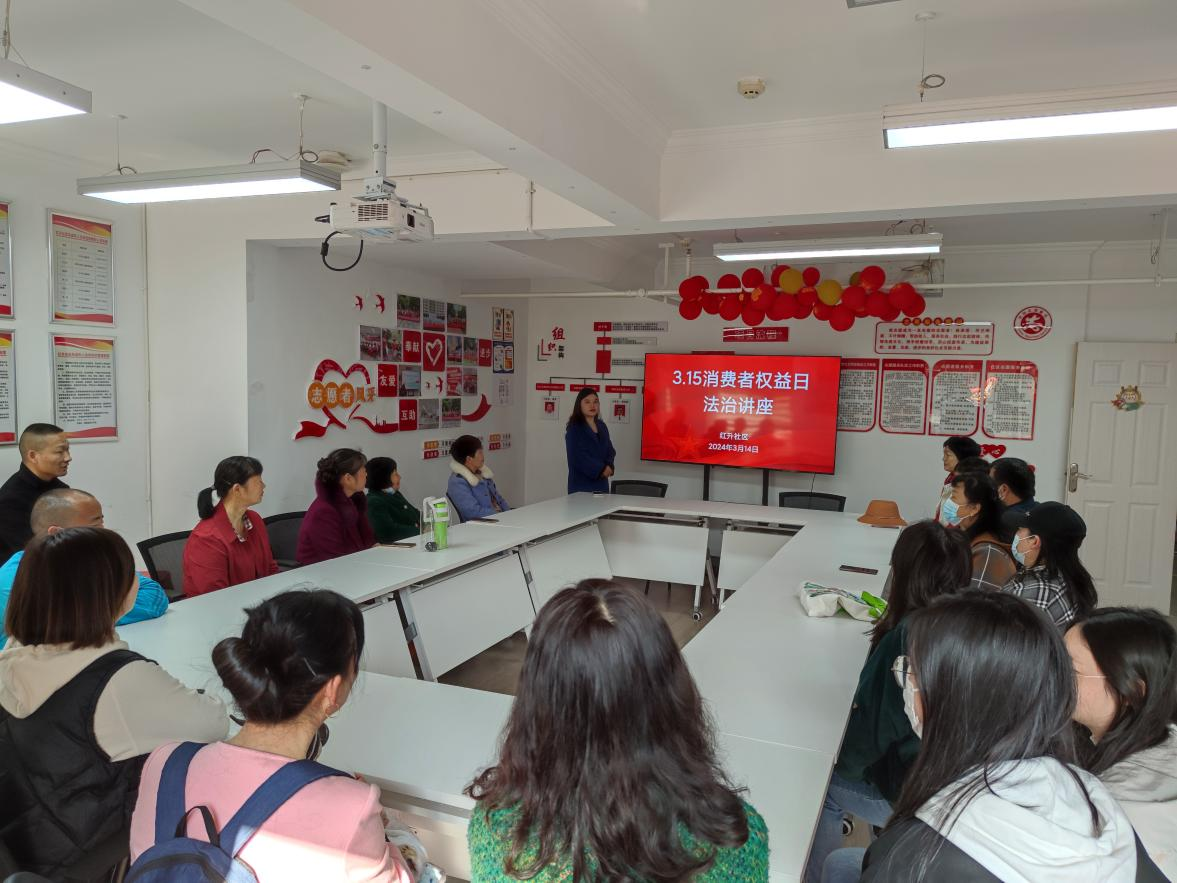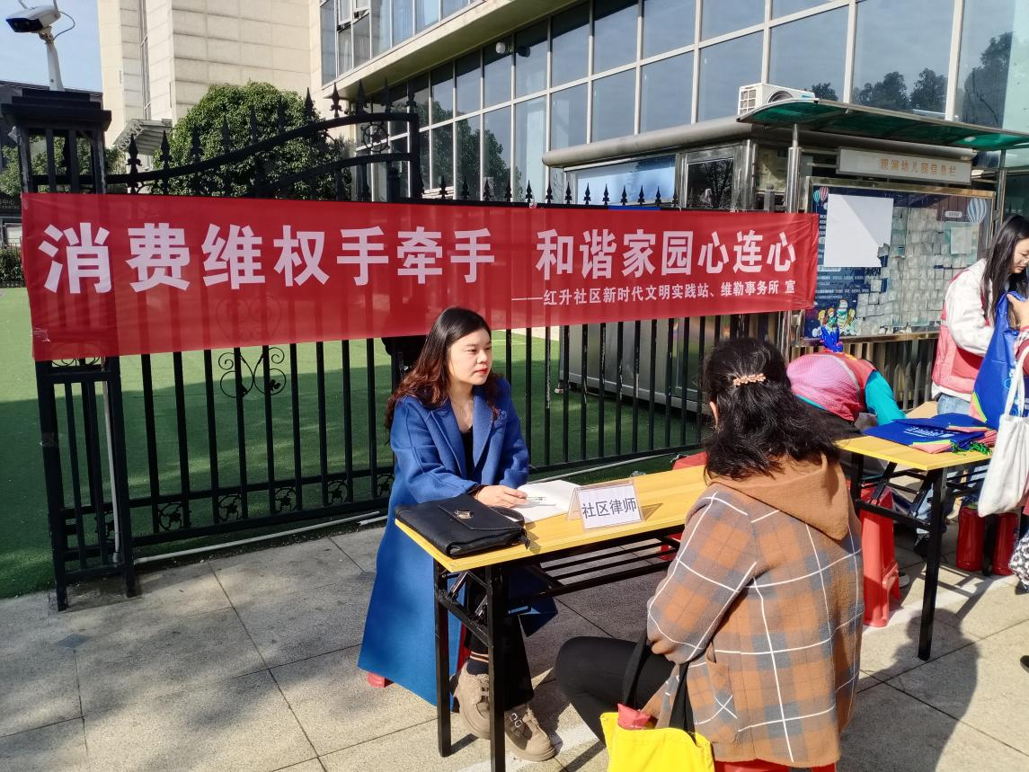 车谷融媒3月15日讯 为普及消费者权益的相关知识,提高居民的维权意识,引导居民科学、合理、文明消费,3月14日上午,沌阳街道红升社区新时代文明实践站联合维勒律师事务所开展3·15普法知识宣传活动。