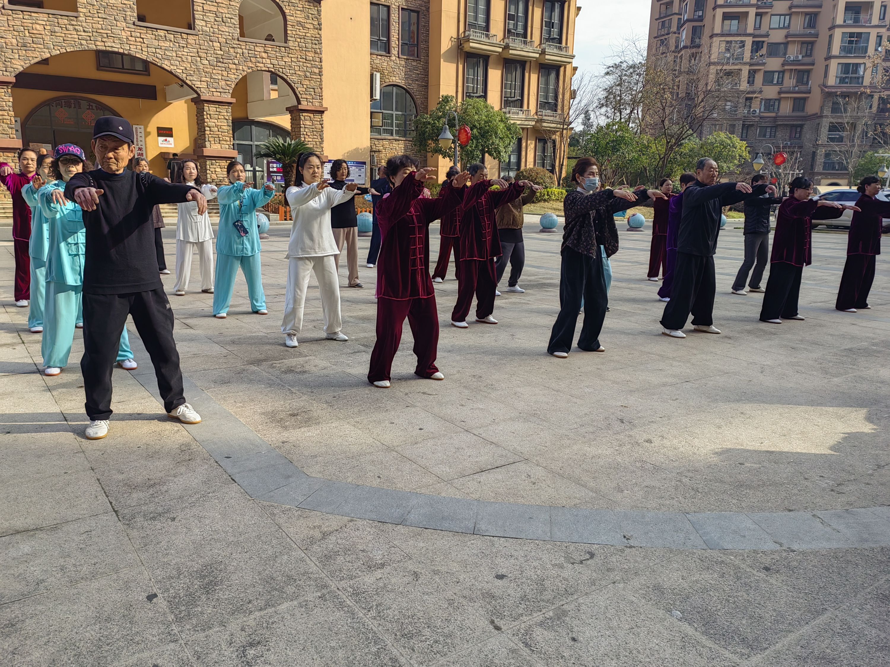车谷融媒3月18日讯 3月15日,武汉经开区军山街道龙湖社区初心广场上,龙湖太极拳队30余人的爹爹婆婆们着浅色太极服、白色太极鞋,神清气爽。他们整齐划一的动作时而温柔飘逸、时而掷地有声、时而铿锵有力,尽显龙湖老人精神面貌。这是社区老人幸福生活的一个缩影。