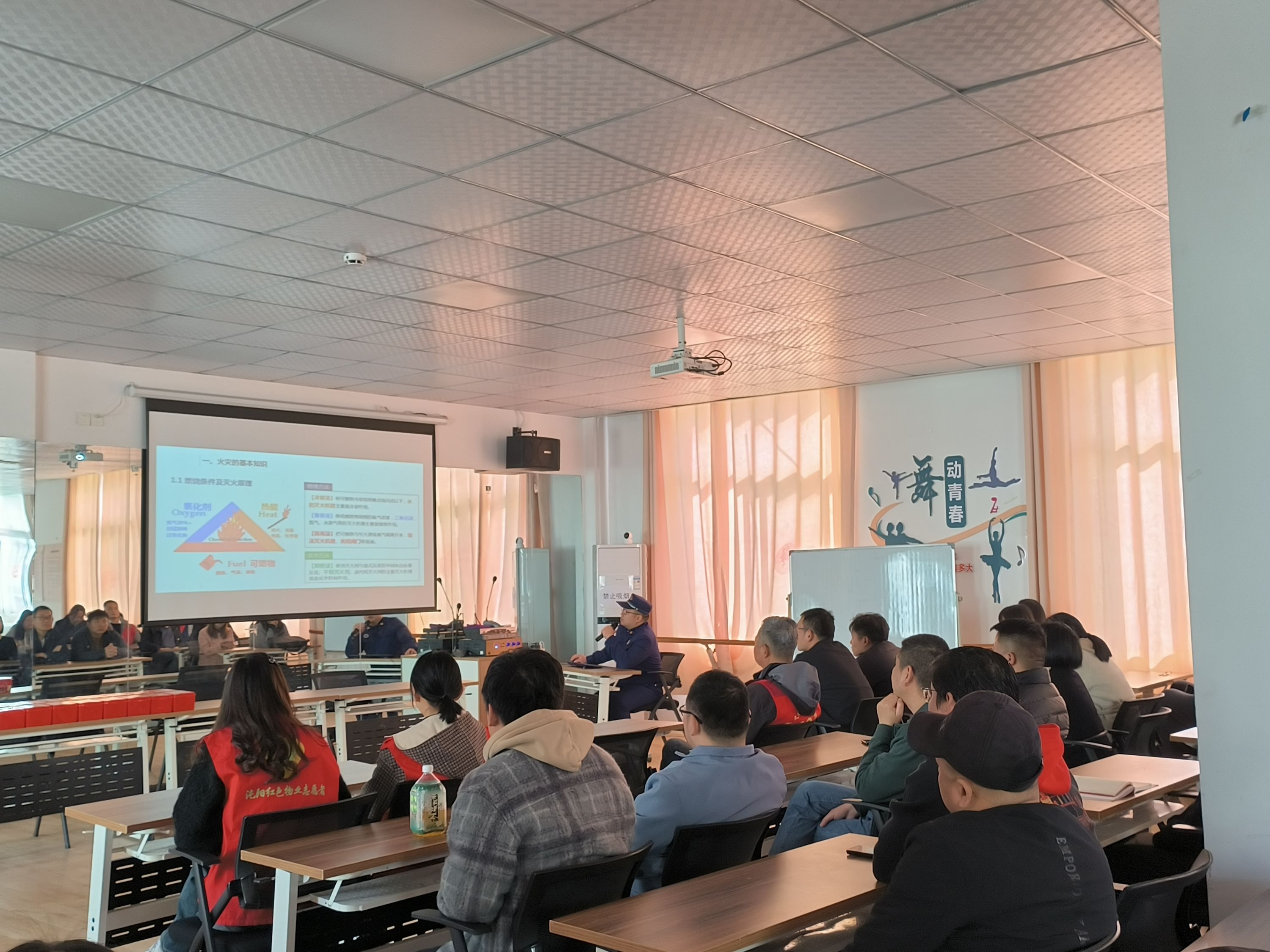 活动现场,永久社区邀请沌阳街专职消防站队员通过视频、PPT宣讲火灾基本知识、常见消防器材和设施及使用方法、火灾报警注意事项、逃生的基本常识、法律责任及后果、示范过滤试呼吸器正确佩戴方法等内容,使大家明确消防安全演练是严谨的安全防范活动。