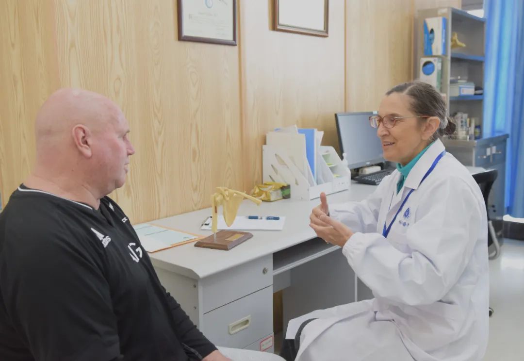 ▲梅雪医生(右)接诊武汉长江外籍人员子女学校新西兰籍教师Ashley Roger Penn。