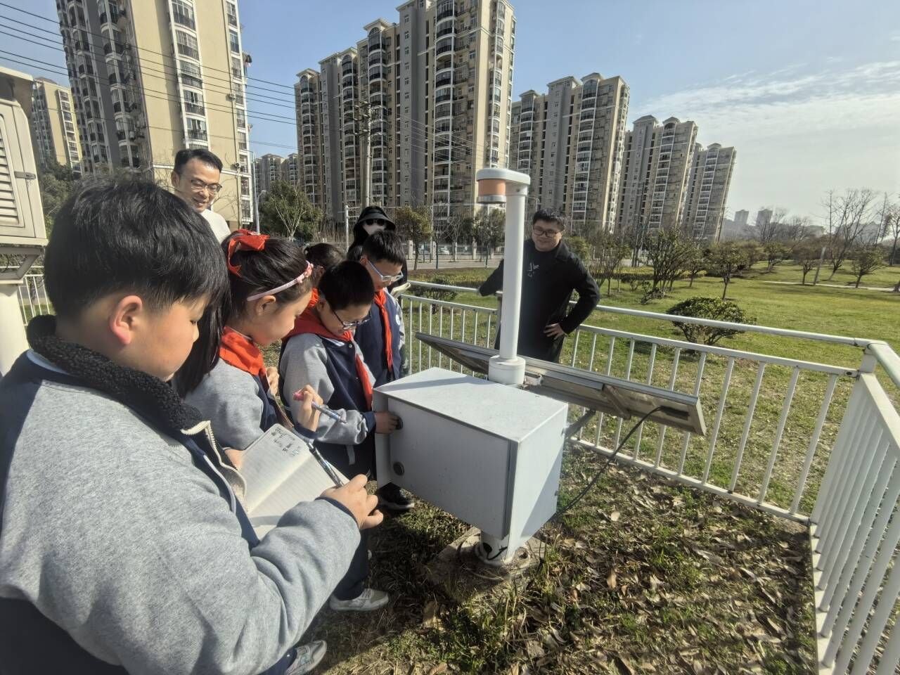 在气象站,讲解员带领队员们零距离体验了百叶箱、风向标、风速仪、雨量器等气象设施,了解了怎样预测天气和怎样测量气象数据。队员们兴致勃勃地观察,一边看一边听一边记录,收获满满。