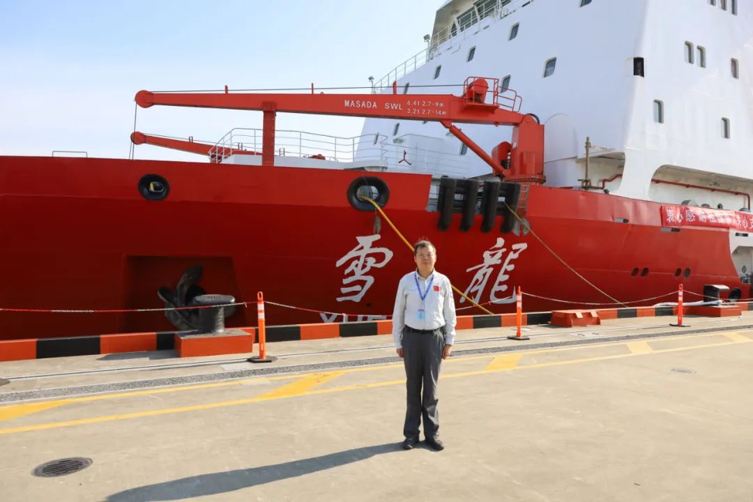 ▲即将出发去南极科考,祝伟在“雪龙”号破冰船前留影。