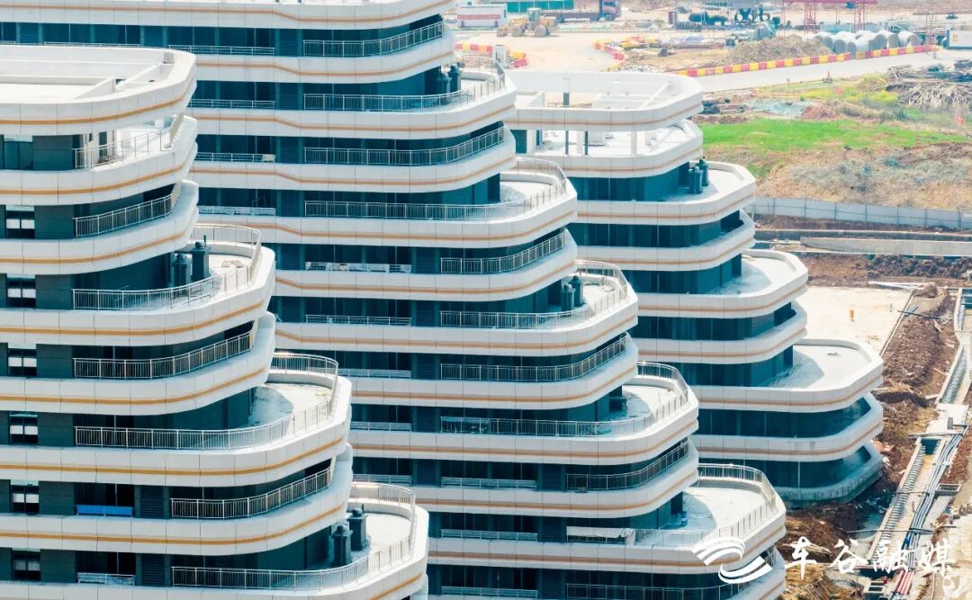 3月25日,阴雨绵绵,在经开大道与汉南大道交汇处、大军山麓,武汉理工大学车谷校区建设现场却热火朝天,人流、车流穿梭交织。一栋栋造型各异的现代化大楼巍然矗立,楼身覆盖着的绿色安全网“面纱”已揭去,“芳容”初现,露出流线型的建筑外形,600余名建设者铆足干劲冲刺8月交付、9月建成投用。