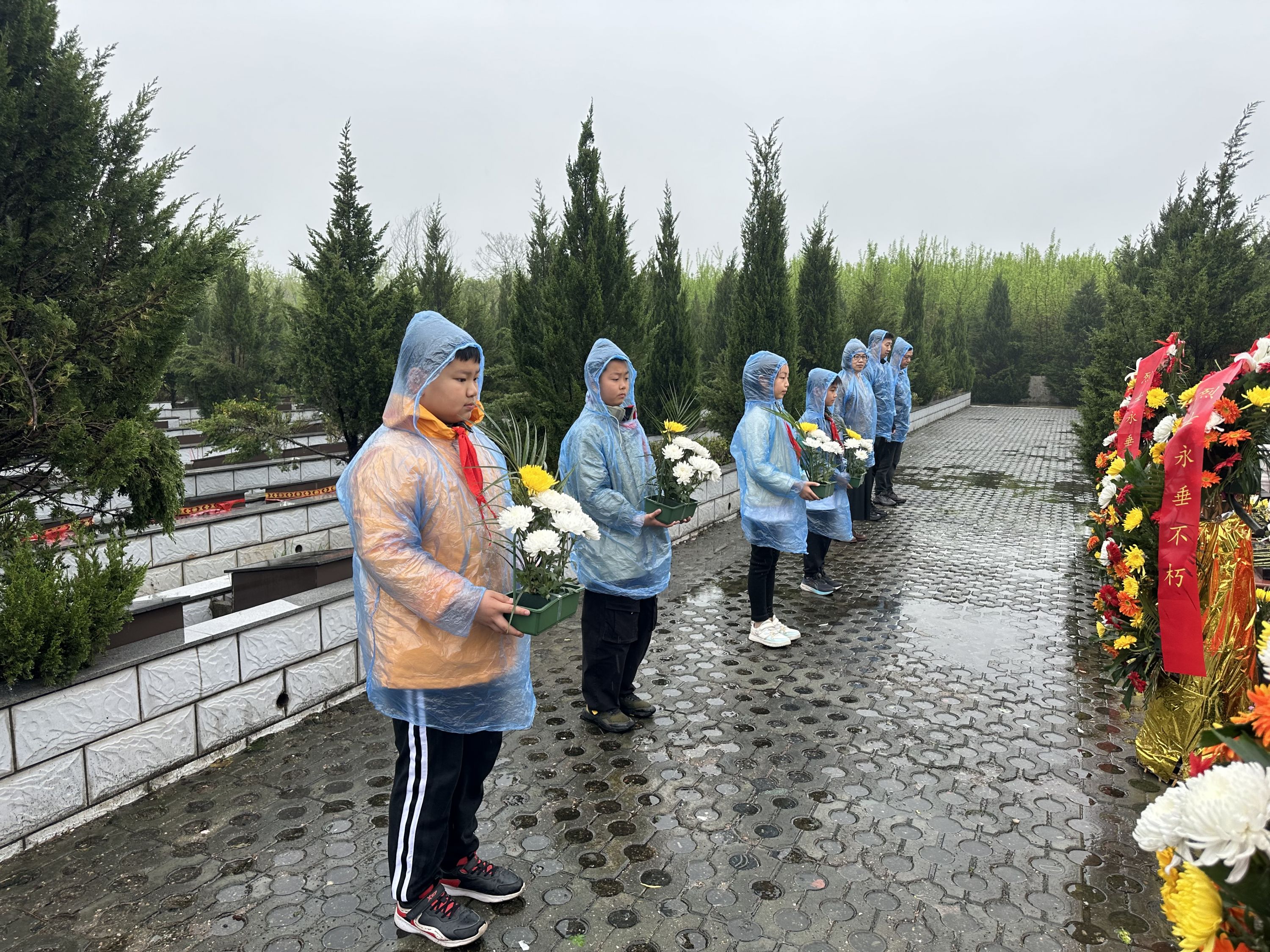 活动现场,少先队员代表身着整洁的校服,佩戴鲜艳的红领巾,整齐有序地来到了汉南区幸福陵园。师生们怀着崇敬的心情,向江贤啟、江贤志、李方训等八位烈士敬献花篮,并默哀三分钟,表达对革命先烈的深切缅怀和崇高敬意。