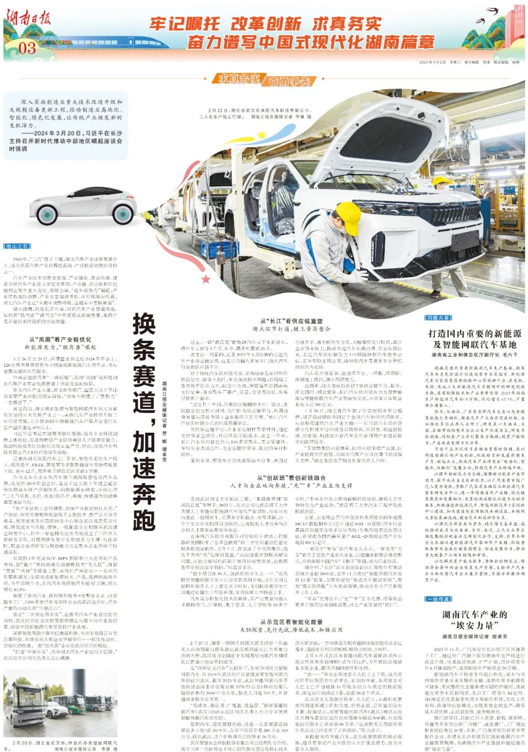 4月2日,湖南日报刊发报道《换条赛道,加速奔跑》,以“中国车谷”武汉经开区为样本,报道湖北汽车产业面对挑战与机遇,“在奔跑中调整呼吸,在超车中更换赛道”。科技创新、产业链优化、供应链重塑、人才培养、先行先试,成为报道的关键词。