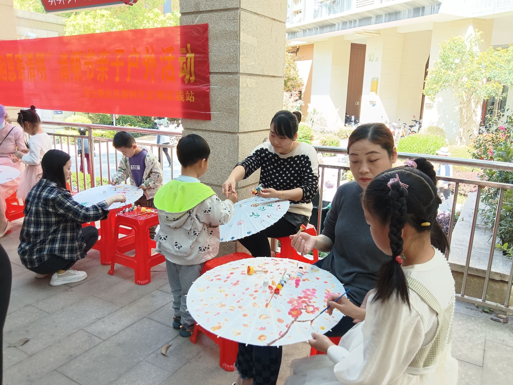 活动中,社区工作人员发放非遗油纸伞材料包,家长和小朋友一起发散思维,创新绘制,在油纸伞上涂鸦自己踏青的所见所想。很快,一幅幅创意作品呈现在一把把油纸伞上,美极了。