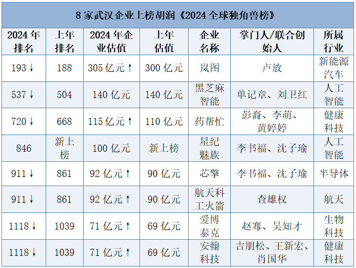车谷融媒4月11日讯 4月9日,胡润研究院发布《2024全球独角兽榜》,武汉8家企业上榜,其中,岚图汽车、星纪魅族、芯擎科技等3家武汉经开区企业入选。